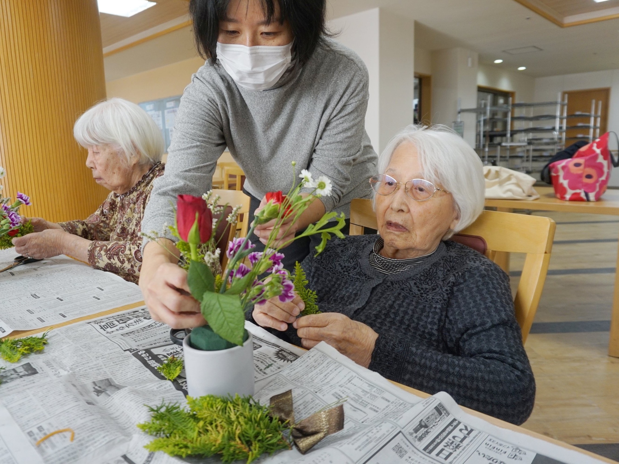 お花の講師をお招きし、フラワーアレンジメントを行いました。講師の丁寧なサポートのもと、皆様がそれぞれの個性を生かしてお花を生け、新鮮な体験を楽しんでいただきました。完成した作品は居室に飾られています。