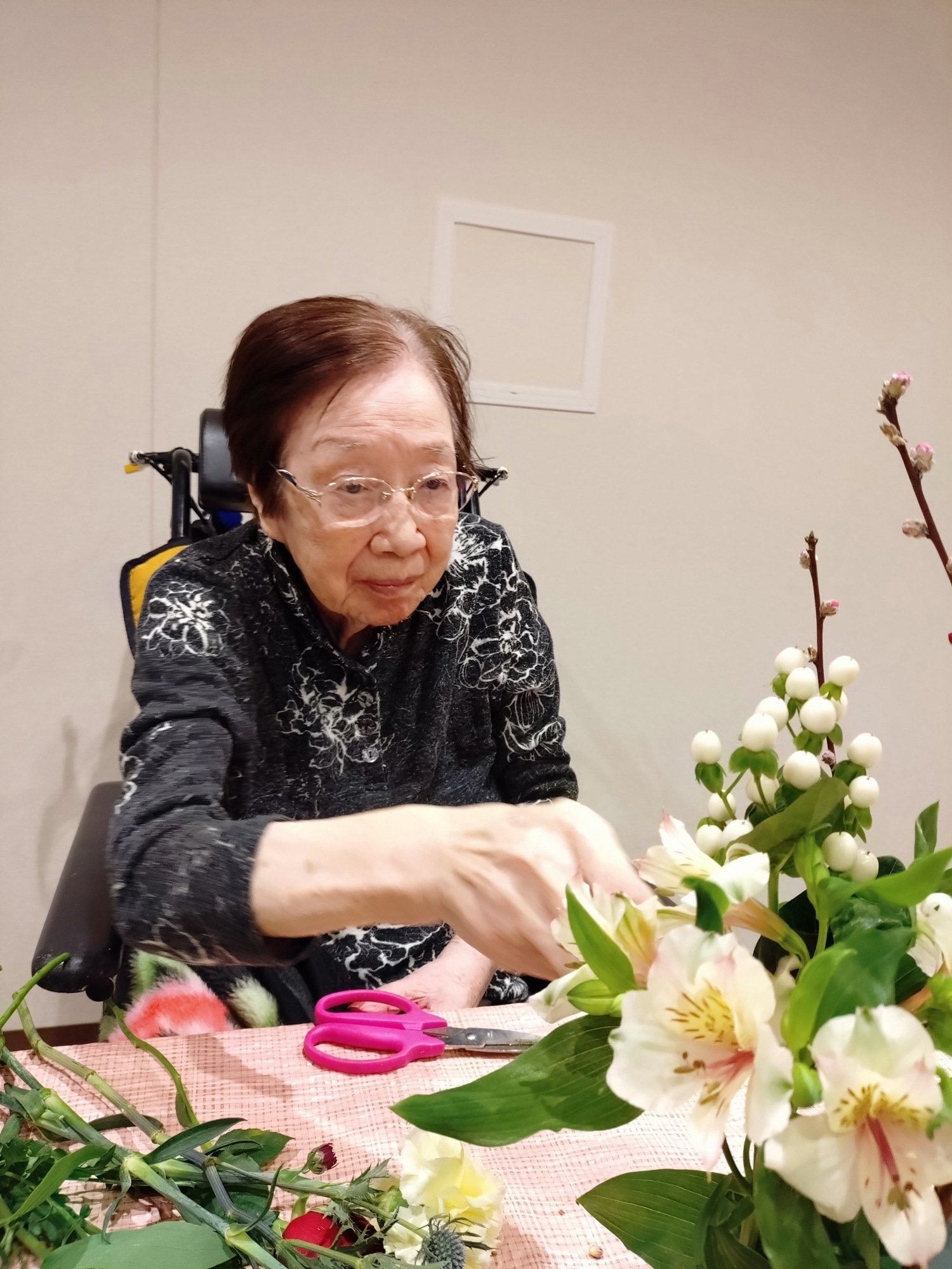 講師の先生より花材の説明をしていただき、テーマ「自由花」に沿って皆さま思い思いに活けました。今回の花材は、桃・バラ・スプレーマム・カーネーション・アルストロメリア・ヒペリカム。 春の訪れを感じさせる華やかな組み合わせです。桃はつぼみの枝を使用したため、お部屋で開花するのが楽しみです。