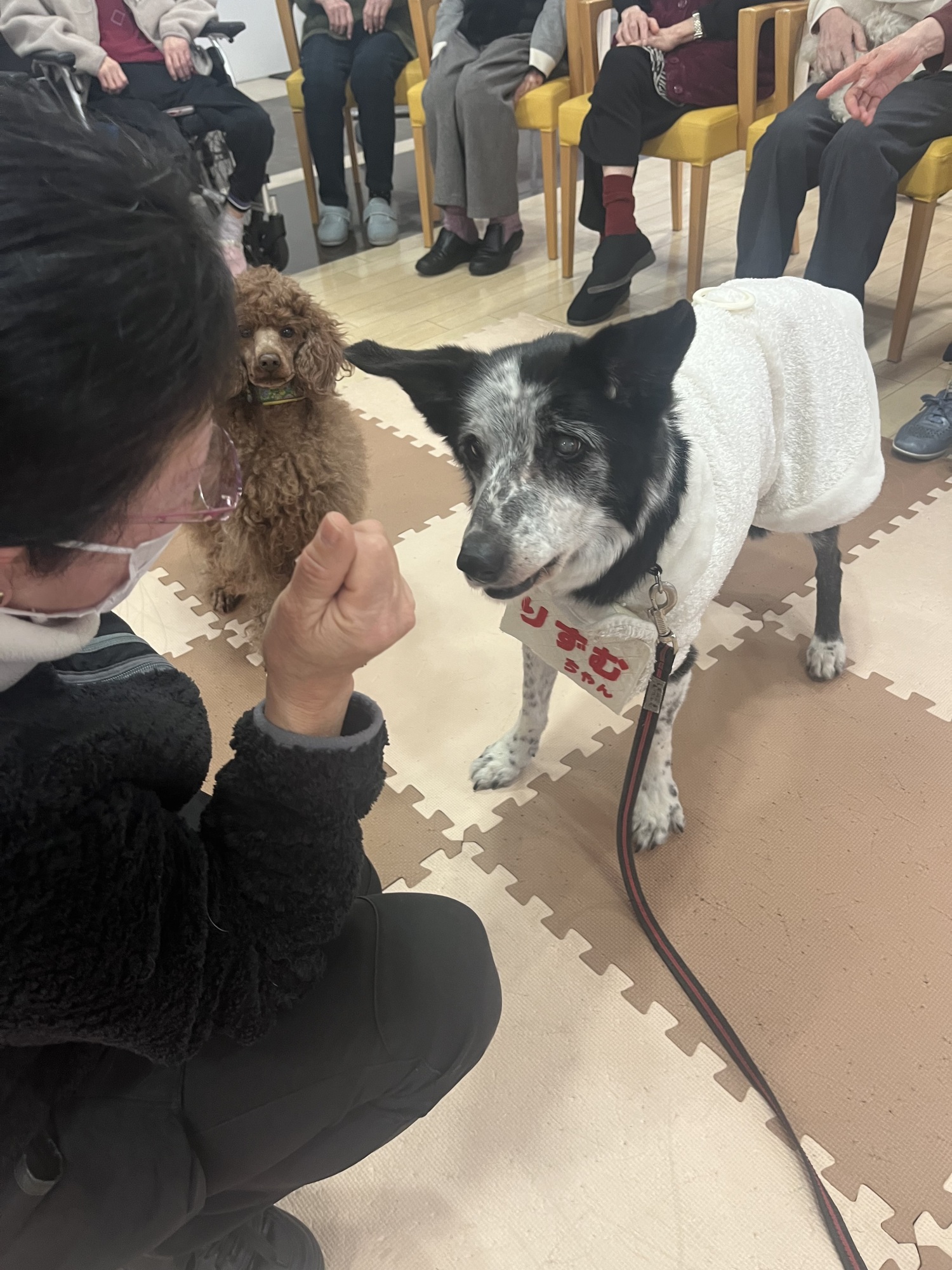ニチイメゾン鉢塚に、かわいいわんこたちが遊びに来てくれました!犬がお好きなお客様も多く、優しくなでたり、そっと手を差し出したりと、ふれあいの時間を楽しまれました。「かわいいね」「癒されるわ」と、皆さまの笑顔があふれ、心がぽかぽか温まるひとときに。いつもと少し違う時間を過ごしながら、わんこたちの可愛らしいしぐさにほっこりされていました♪