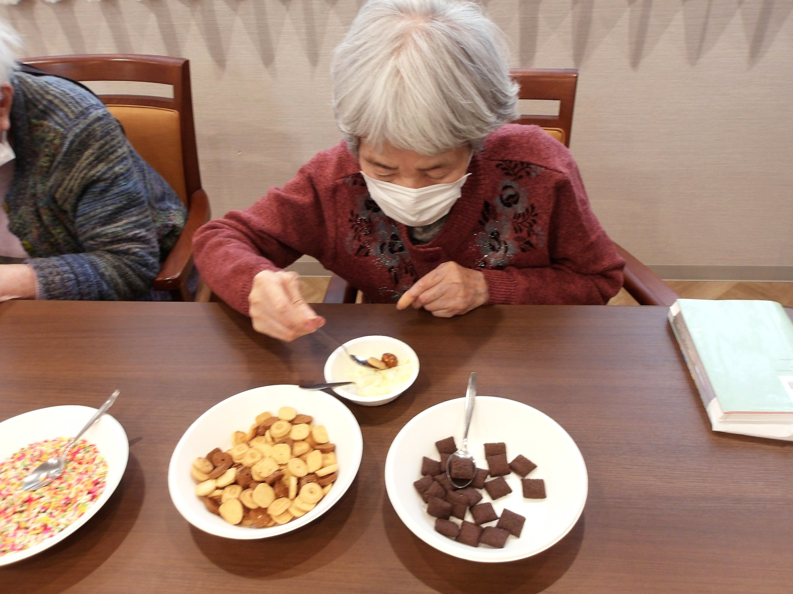 すっかり春らしく暖かくなってきたのでレクリエーションでアイスクリームをご提供いたしました。せっかくなのでさらに楽しんでいただこうとクッキーやカラーチョコスプレー、鈴カステラなどたくさんのトッピングもご用意してお好みのものを乗せていただきました。あれこれ選んで楽しく召し上がっていただけたようです。 全部乗せなんて方もいらっしゃった。バニラアイスがさらに美味しくなりました。