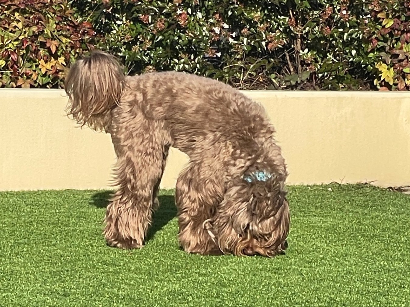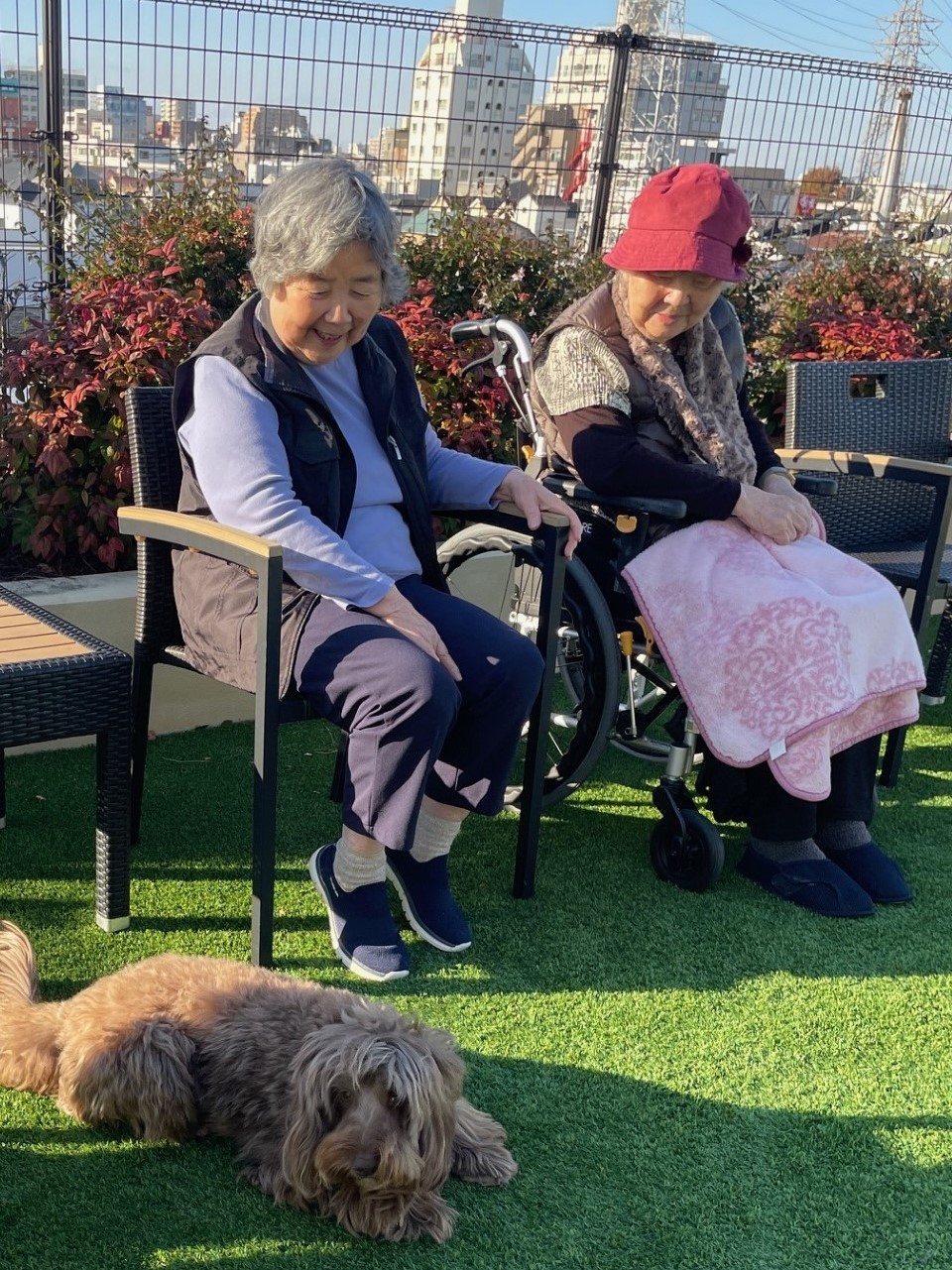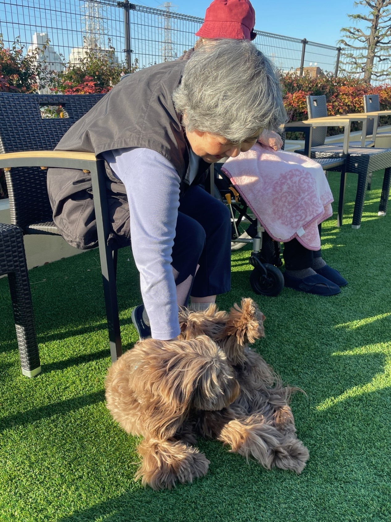 お客様が屋上で日光浴を楽しまれる中、セラピー犬のエルくんもご一緒させていただきました。お客様の足元でリラックスしながら寝返りを打ち、撫でてもらうことで、エルくんも心地よい時間を過ごしました。少し風が冷たく感じられる日でしたが、日光がたっぷりと差し込み、温かさを感じられるひとときとなりました。