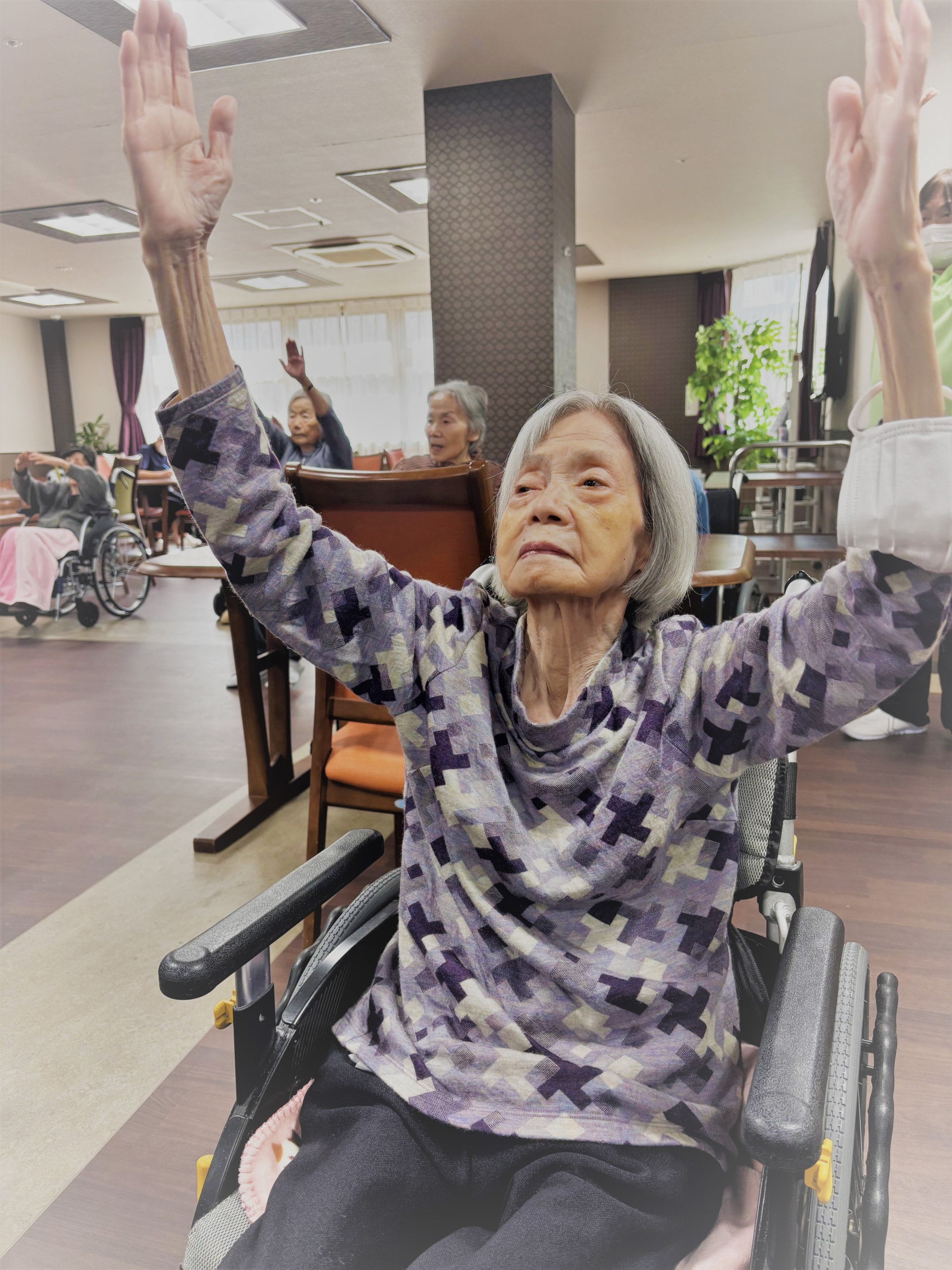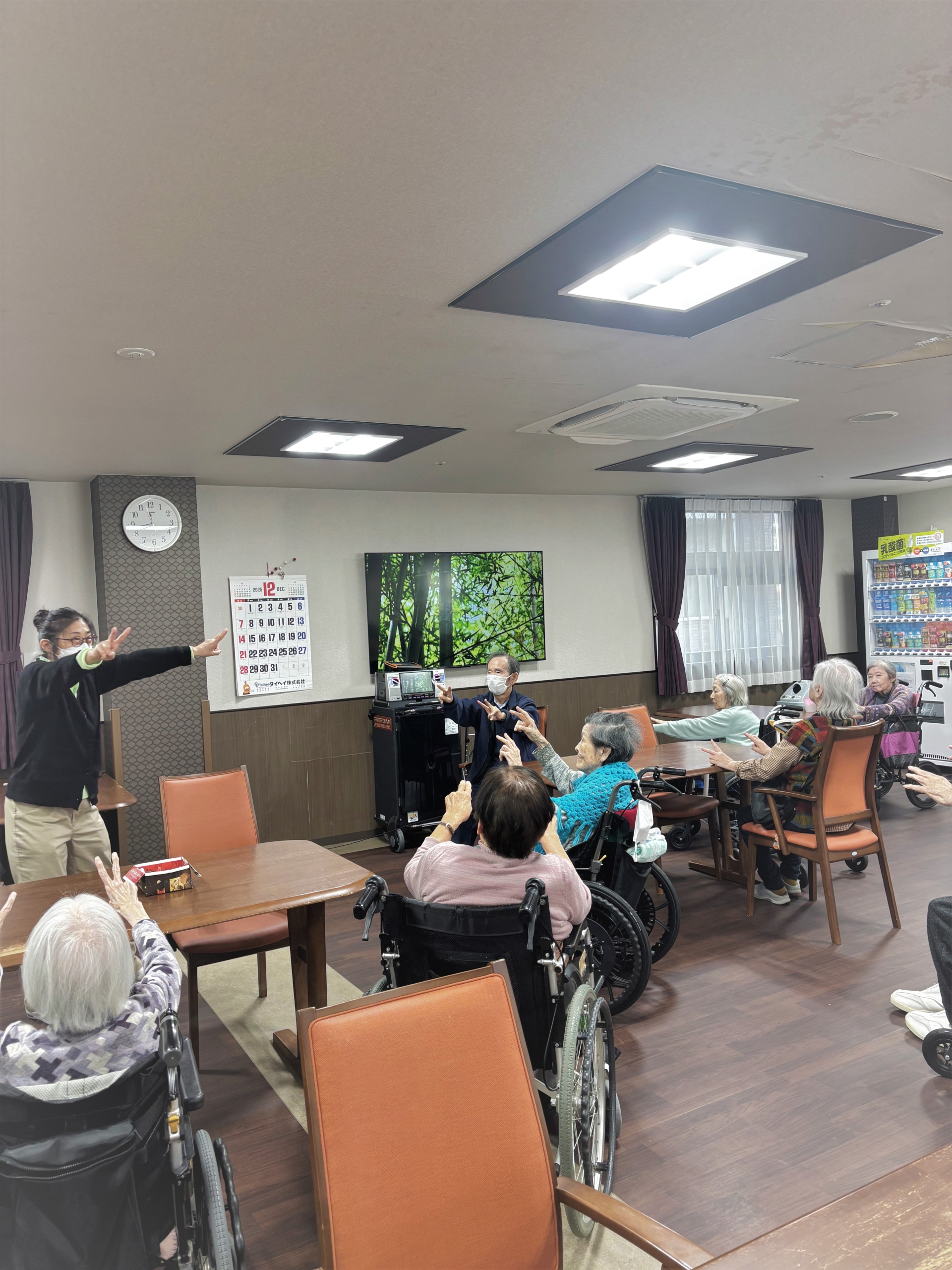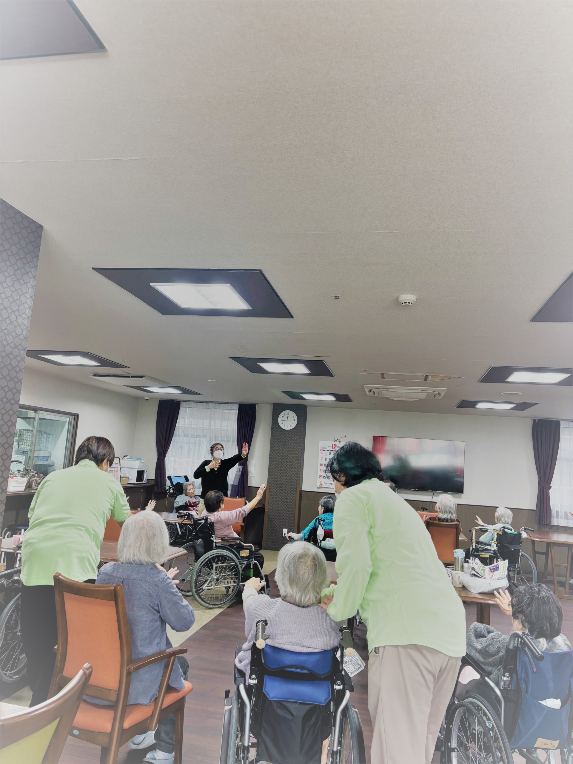 今日は体操の日です。食堂に集合して、楽しい脳トレと座ったままでもできる体操を行いました。体操はとても人気のレクリエーションで皆さま真剣に取り組んでいらっしゃいます。