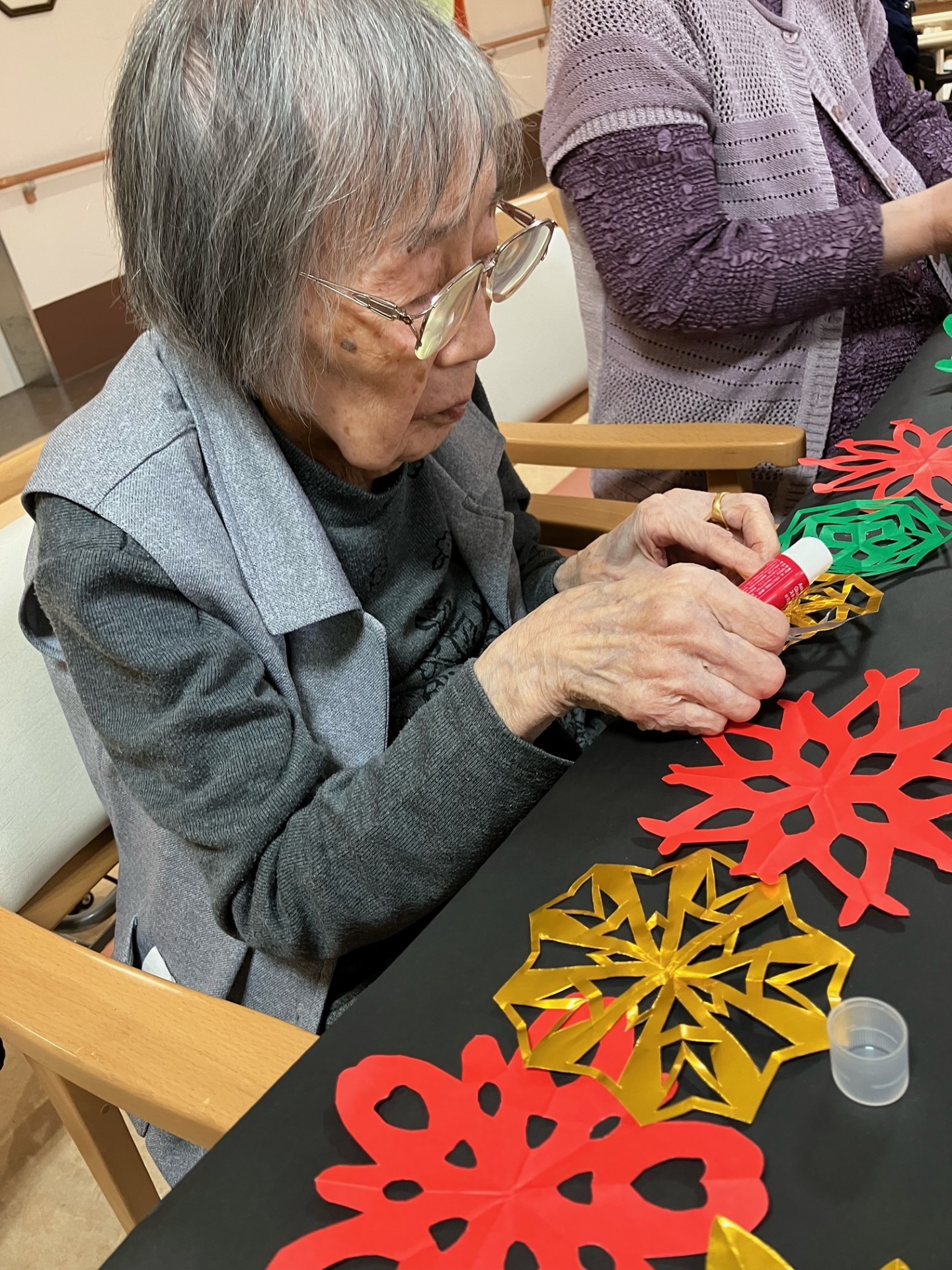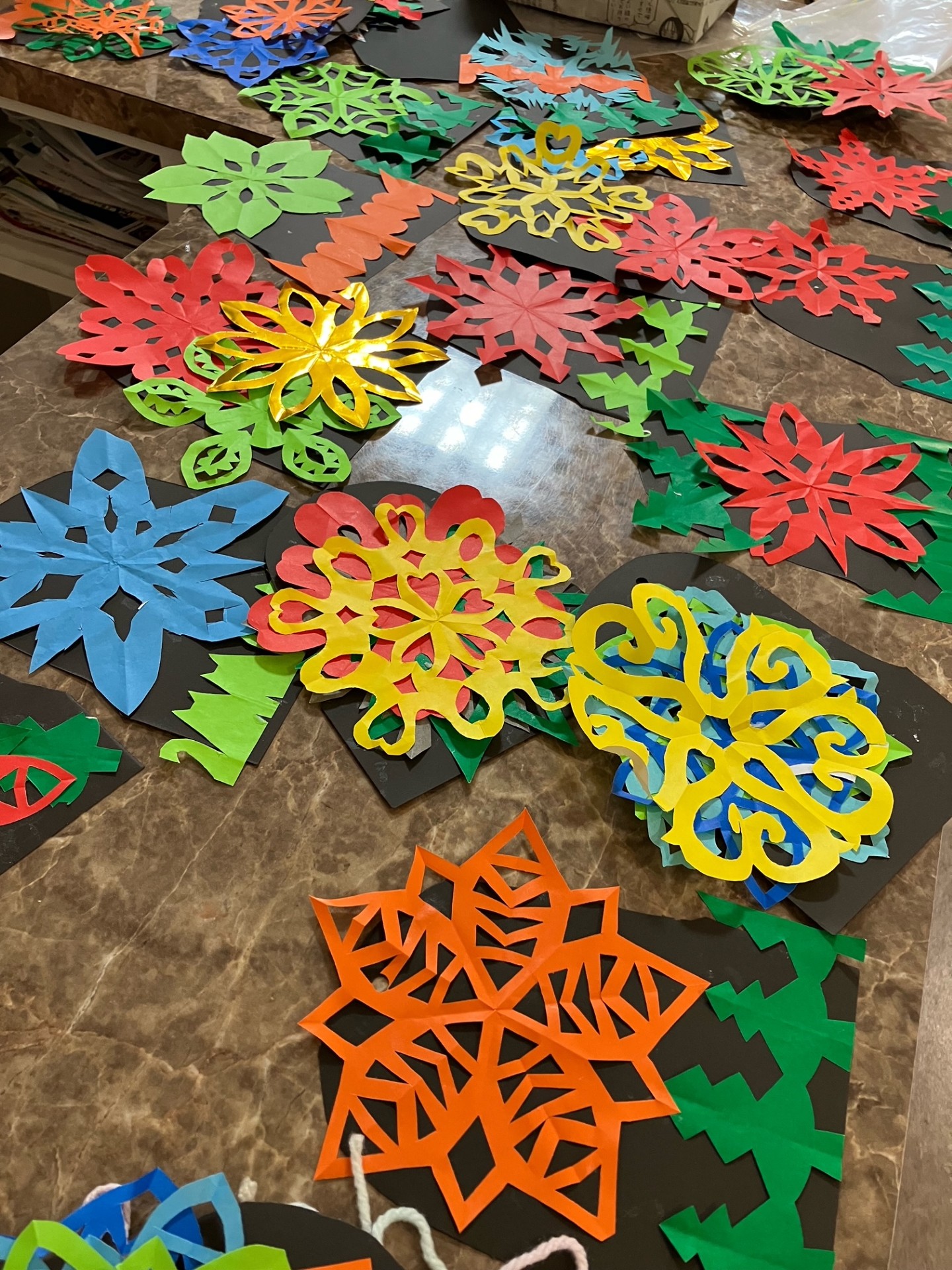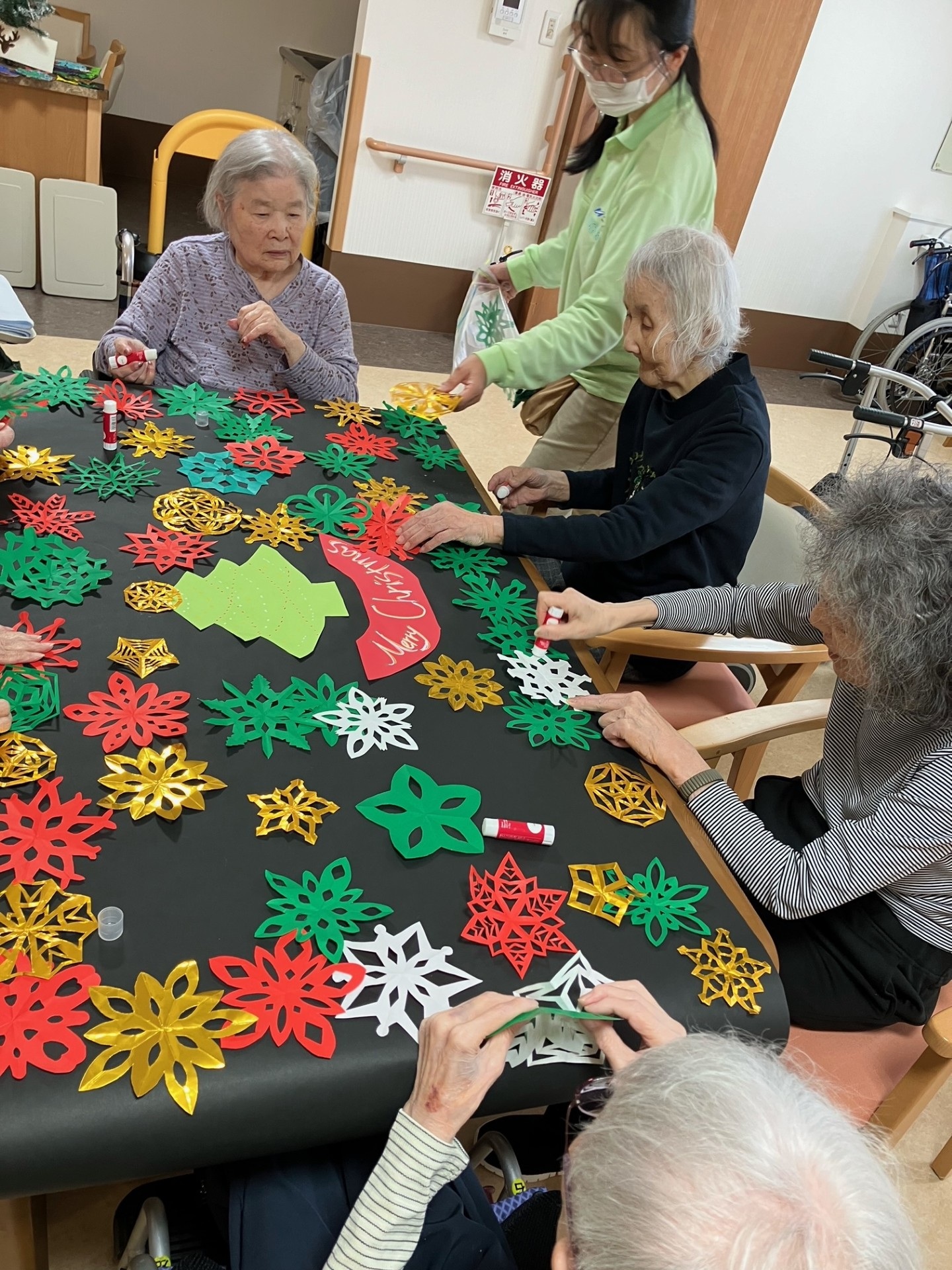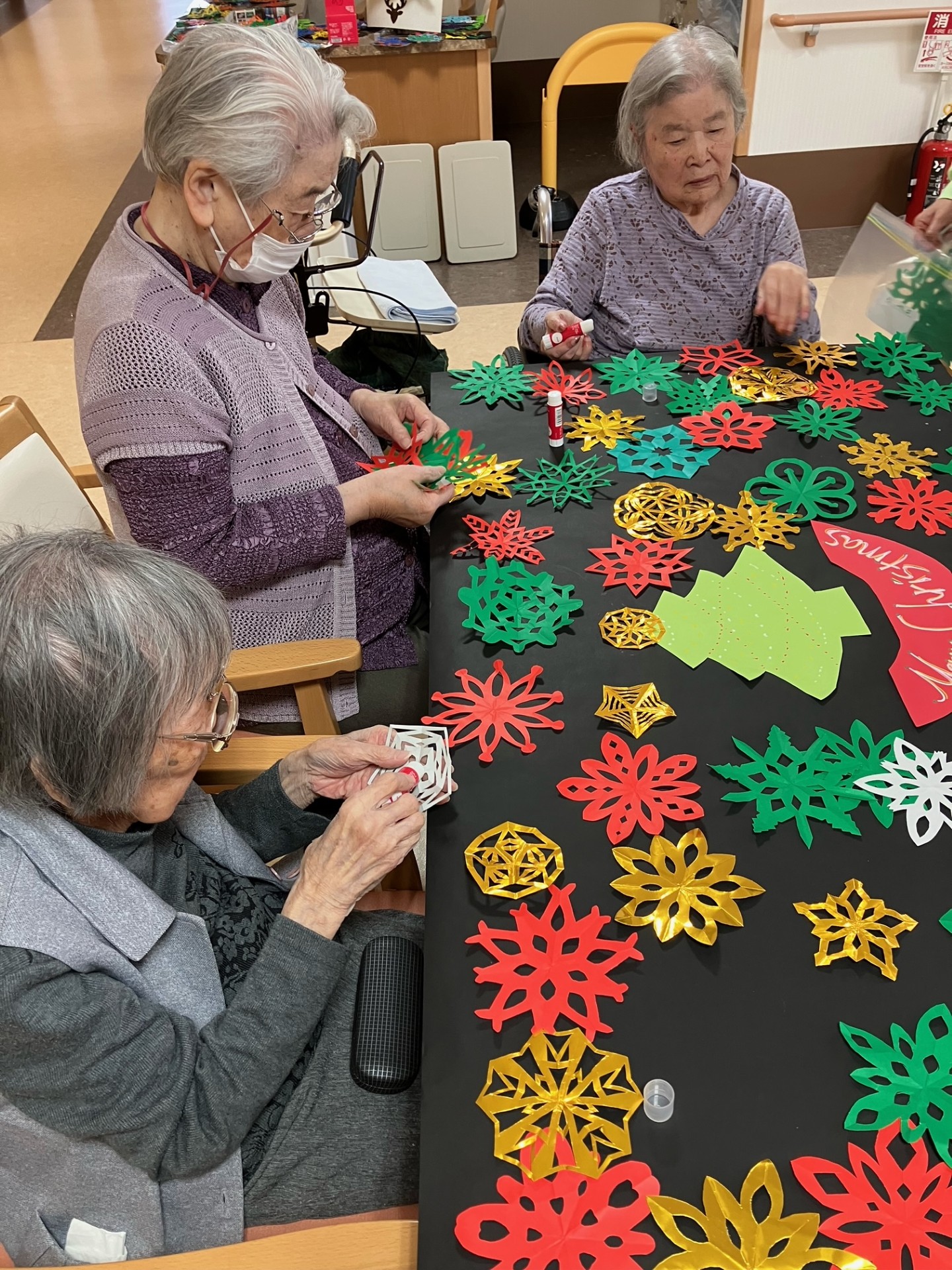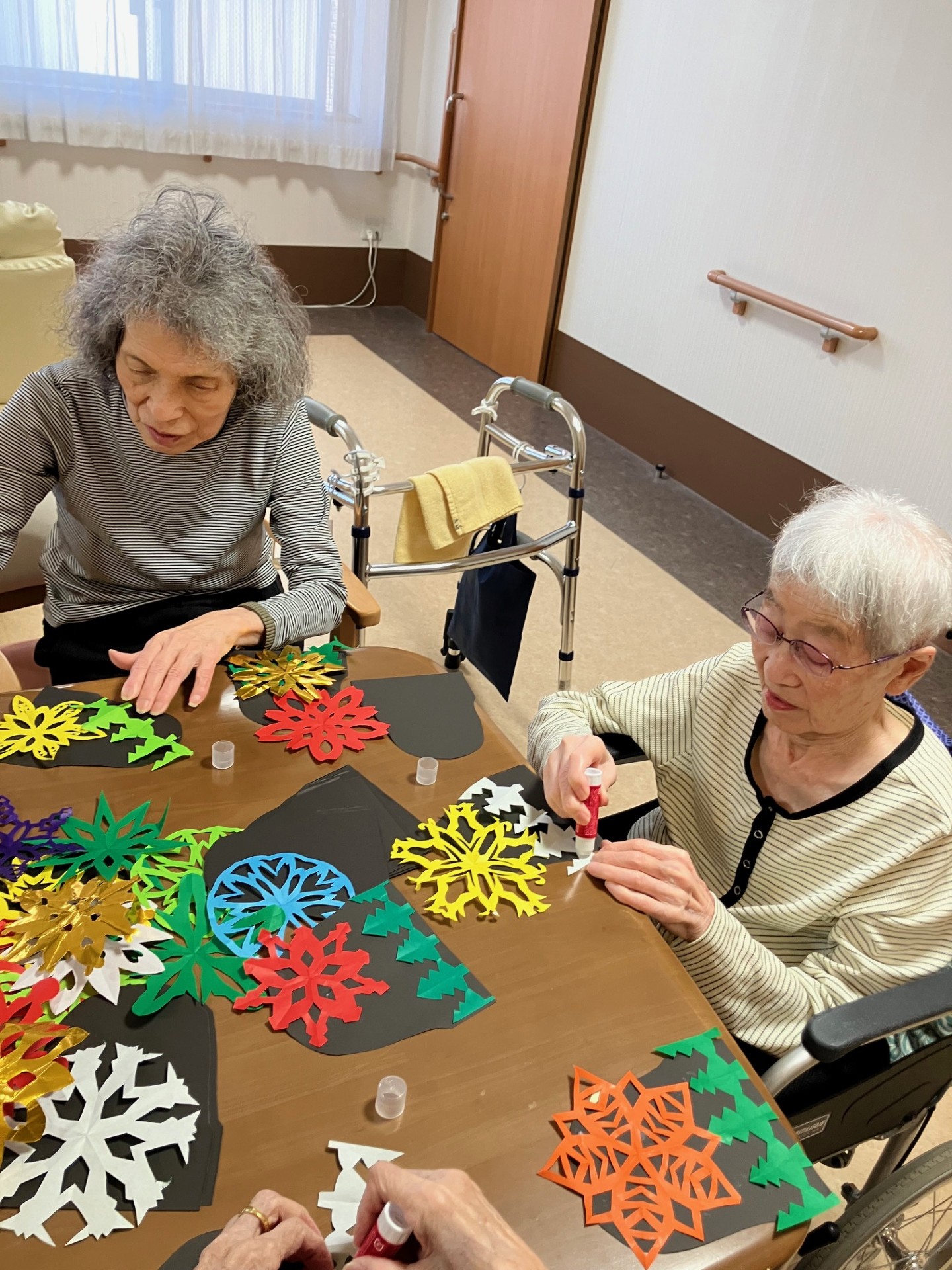 今日は折り紙で作った様々な紋切り(模様)を使って冬飾りを作成しました。大きな壁飾りや、お部屋の表札の飾りなど、たくさん作っていただきました。同じ型紙から切り抜いても少しずつ違いがあって、切った方の個性が出るようです、奥が深いですね。