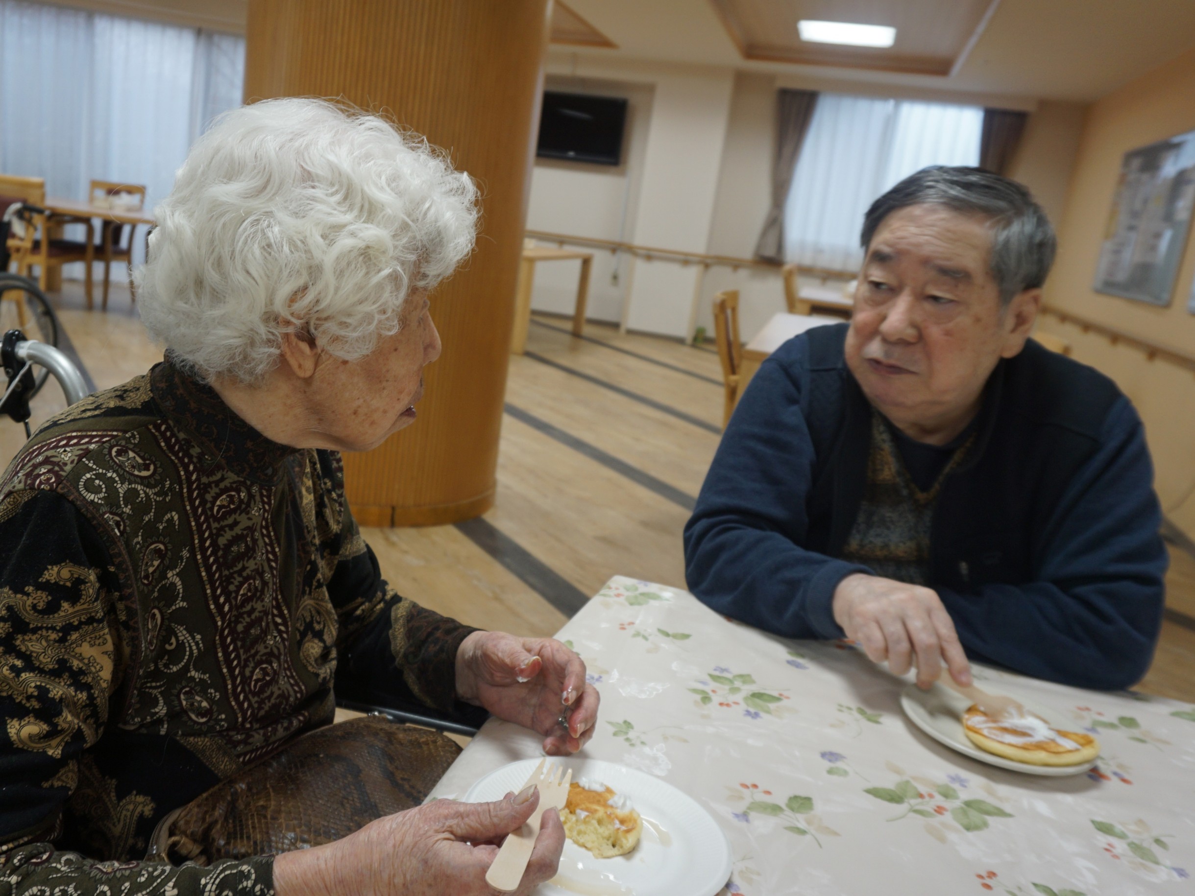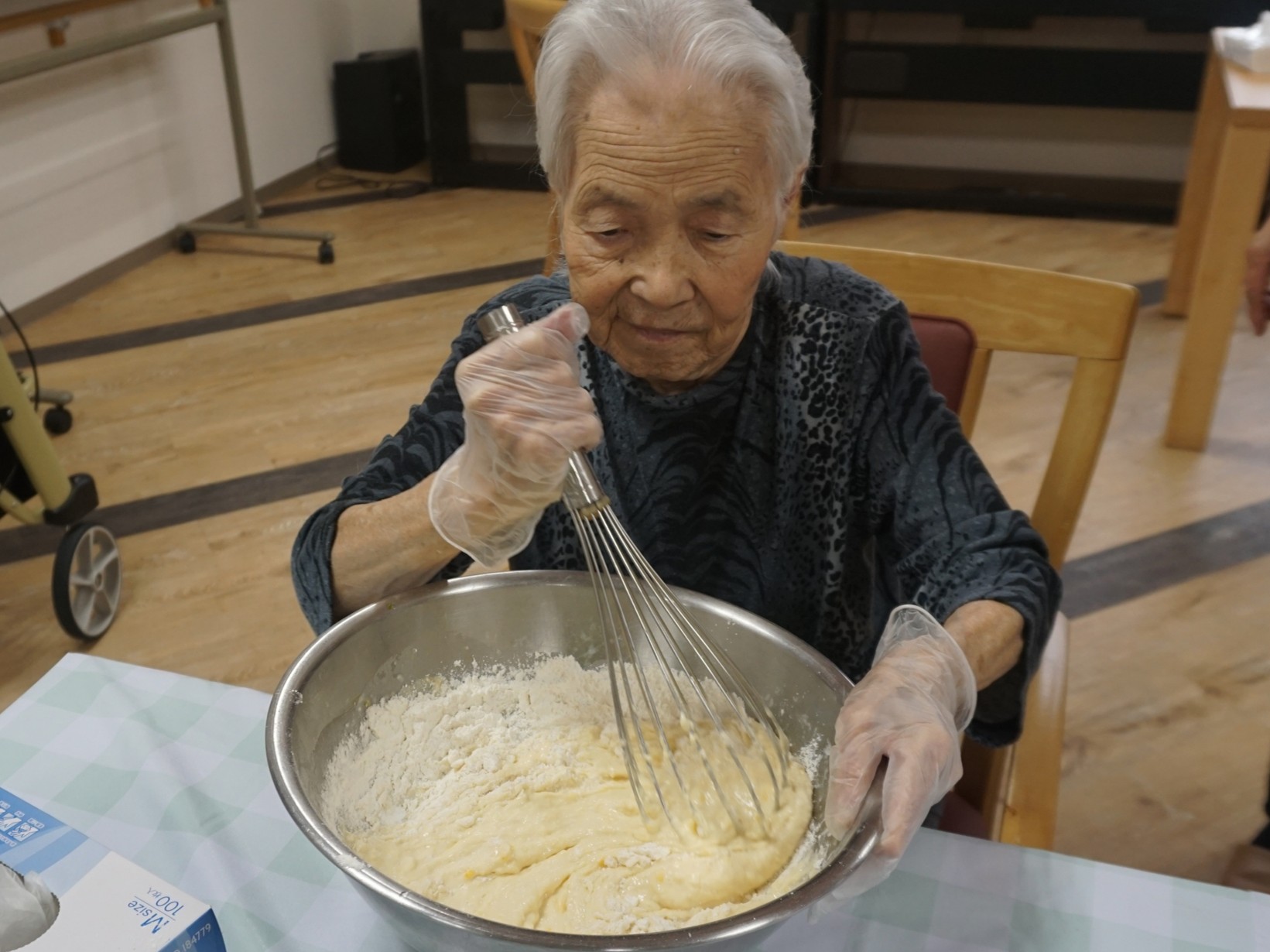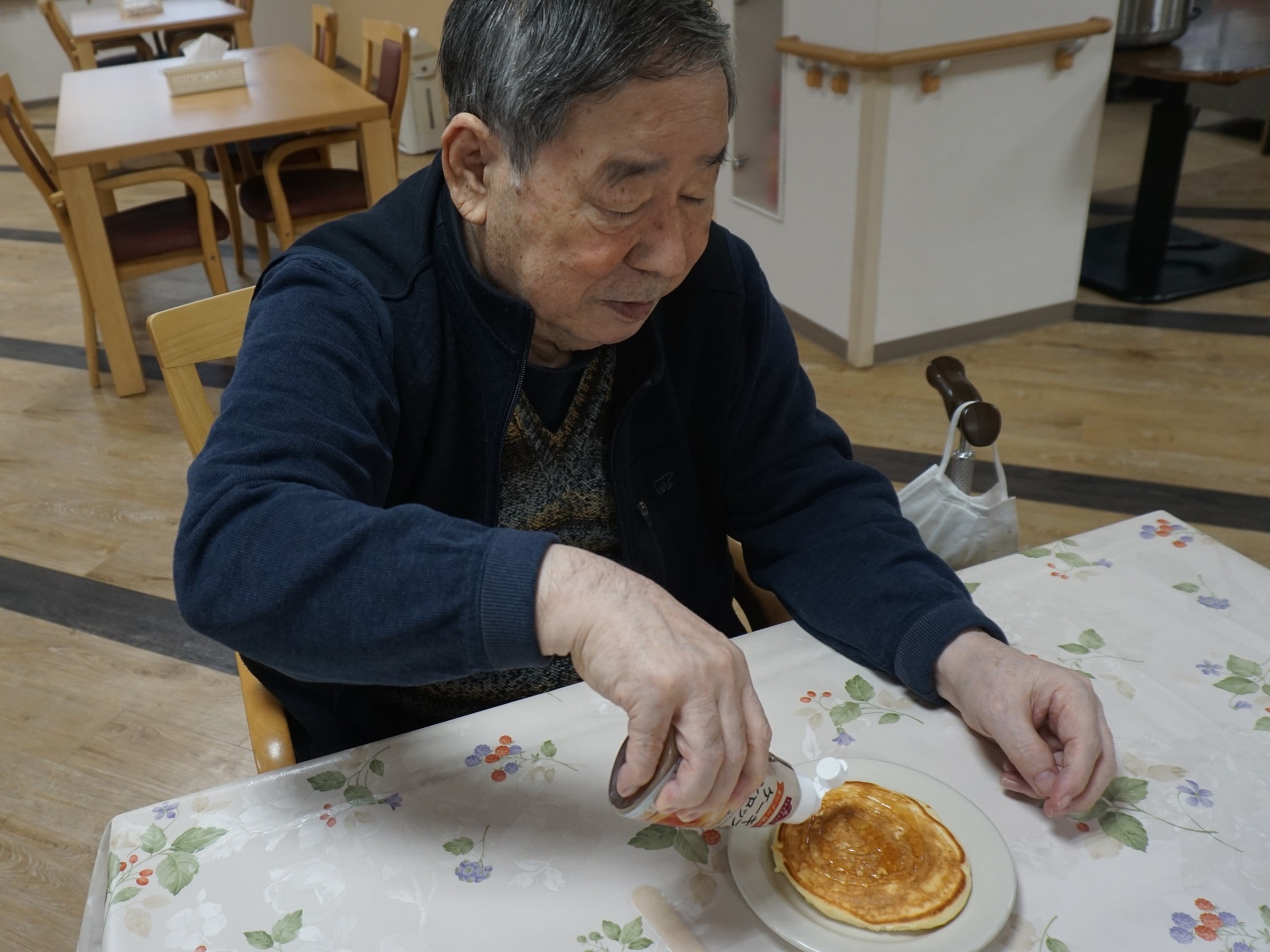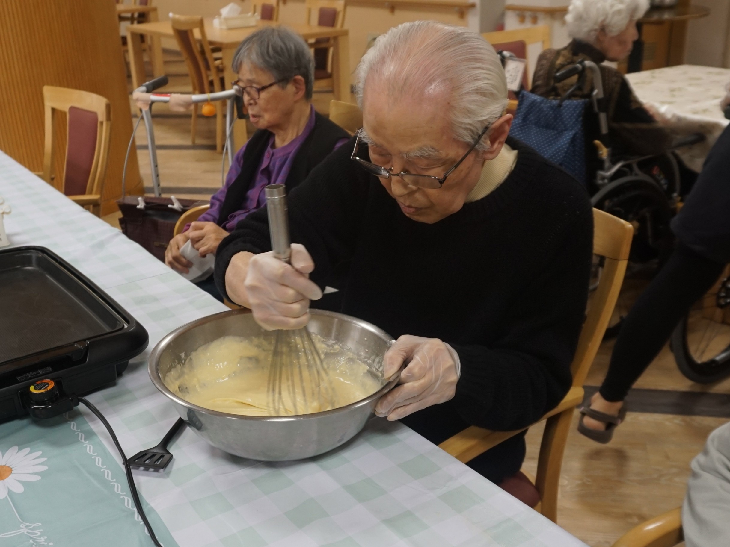 料理サークルでホットケーキを作りました。生地からお客様と一緒に作り、焼いていきました。焼き上がり後はクリームをトッピングして召し上がっていただきました。