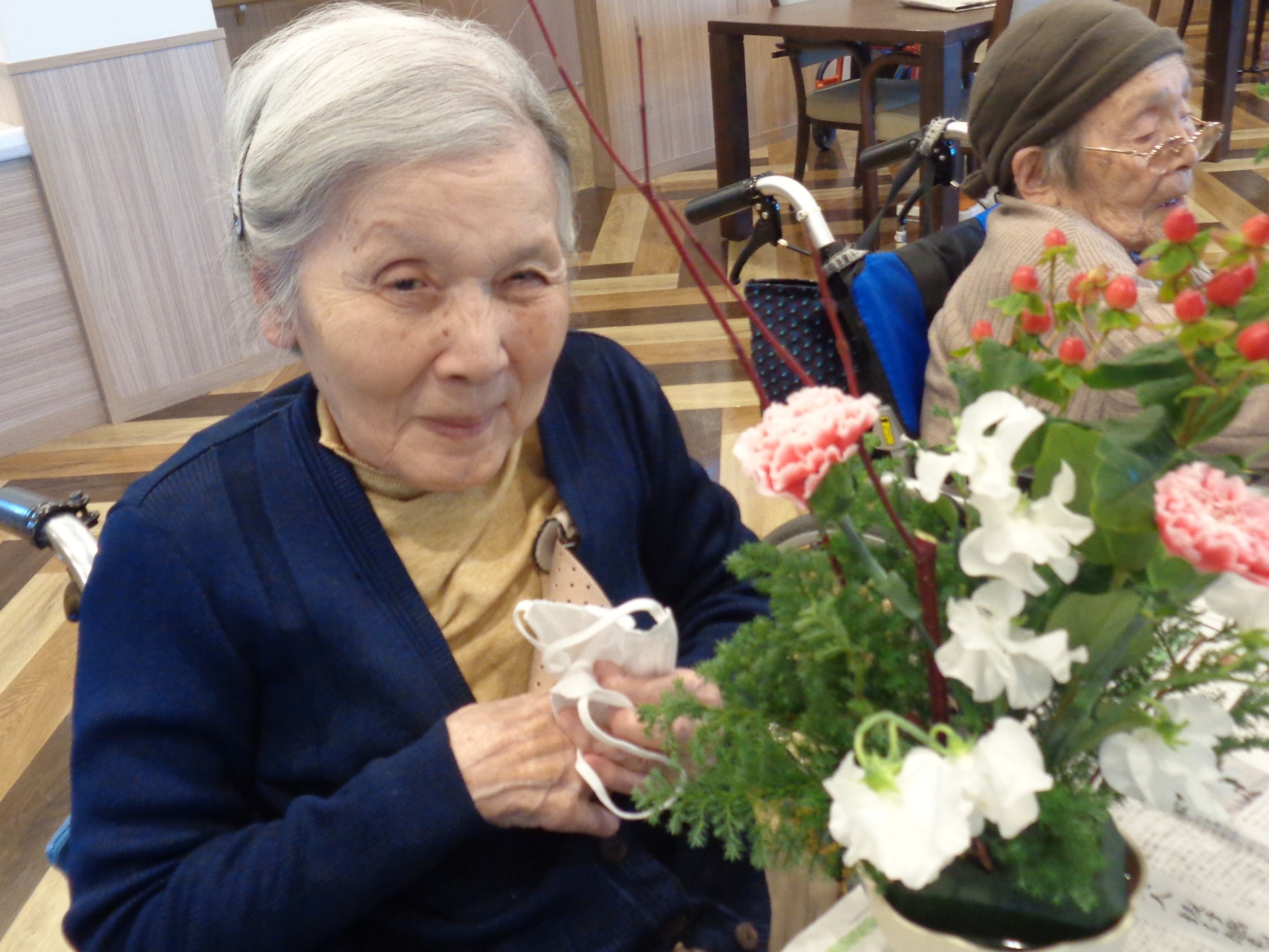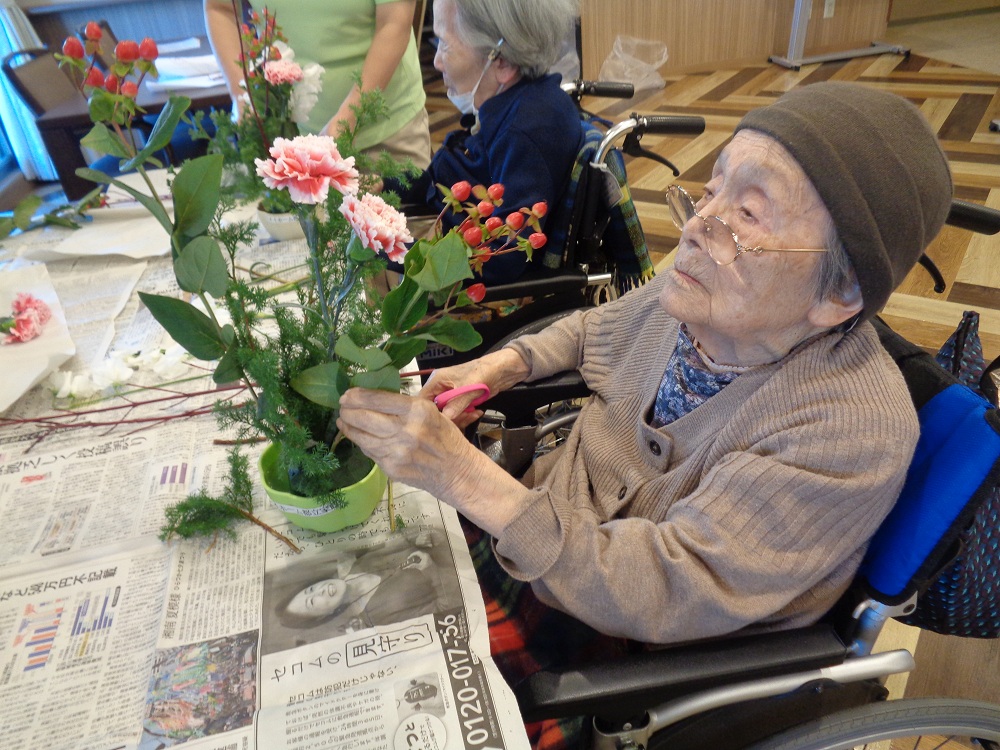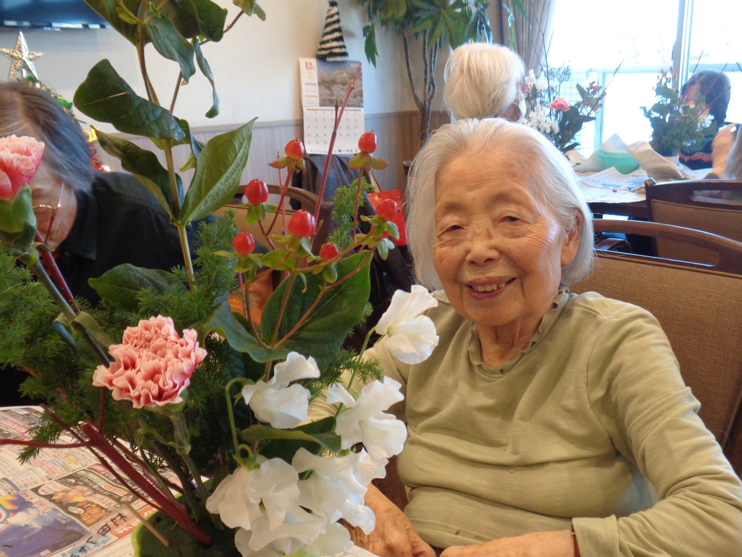 定期開催されているフラワーアレンジメントは、人気のアクティビティの一つです。今回はクリスマスカラーのお花をご用意しました。サンゴ水木という赤い枝の植物から青々とした葉っぱが出て成長を楽しまれるお客様もいらっしゃいました。