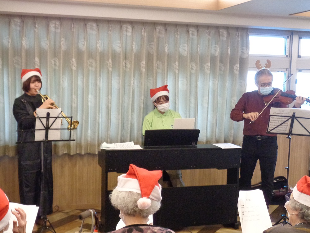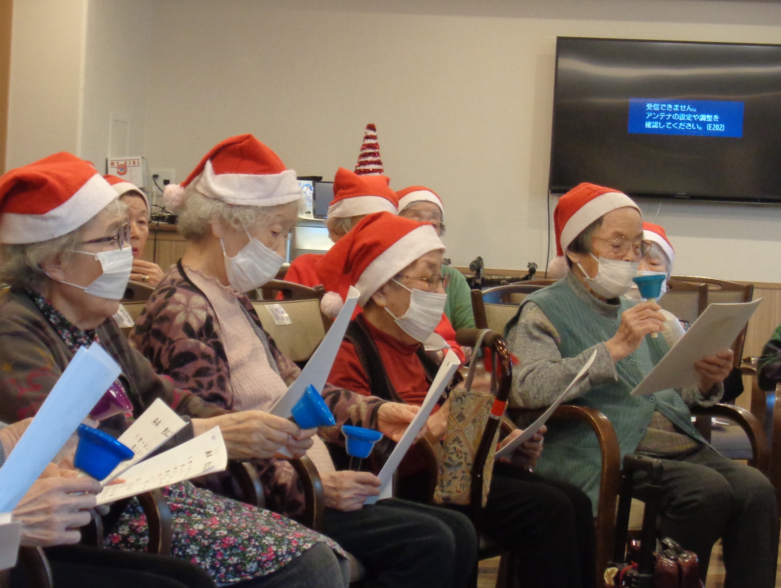 ニチイホーム都立家政のクリスマス会をご紹介します。今年はボランティアの方とスタッフによるピアノ・ヴァイオリン・トランペットの演奏会を行いました。また、毎週土曜にお客様有志で練習をしたハンドベルの演奏も披露して頂きました。皆様にもサンタ帽をかぶって頂き、華やかなクリスマス会となりました。