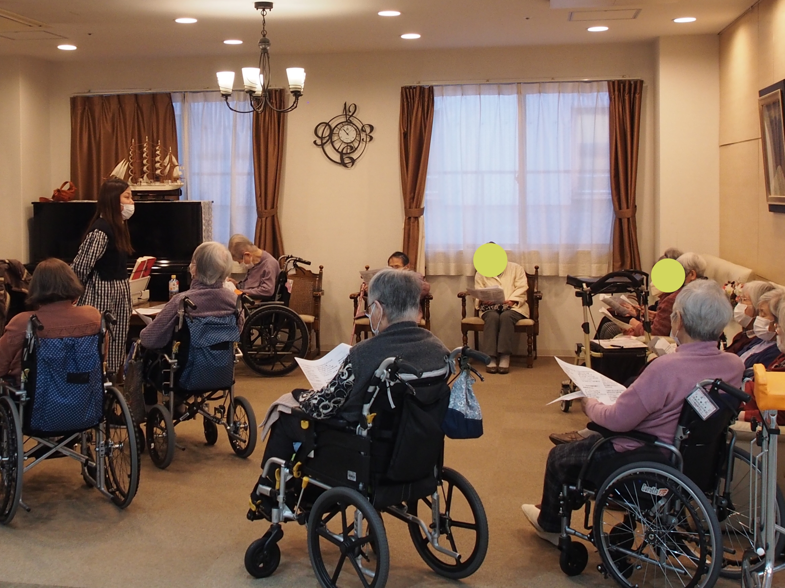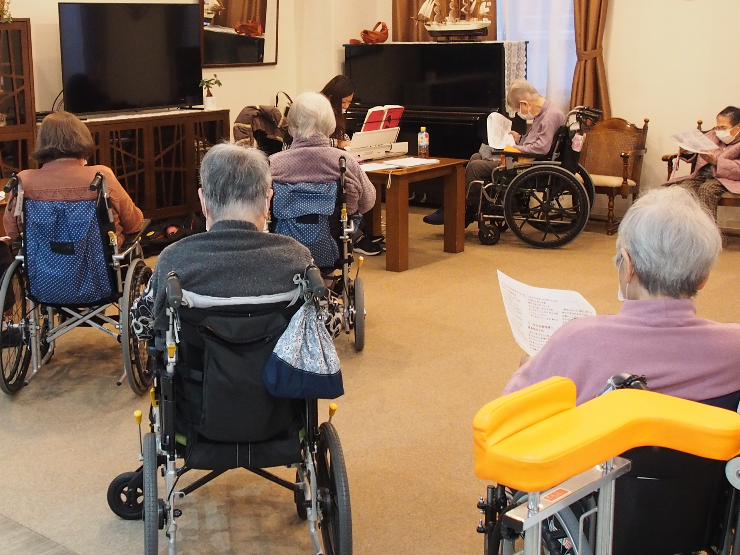 音楽療法を開催しました!当日は14名ほどの方がお集まりになり、手元の歌詞カードをご覧になりながら、様々な年代の歌を皆さまで歌われていました。