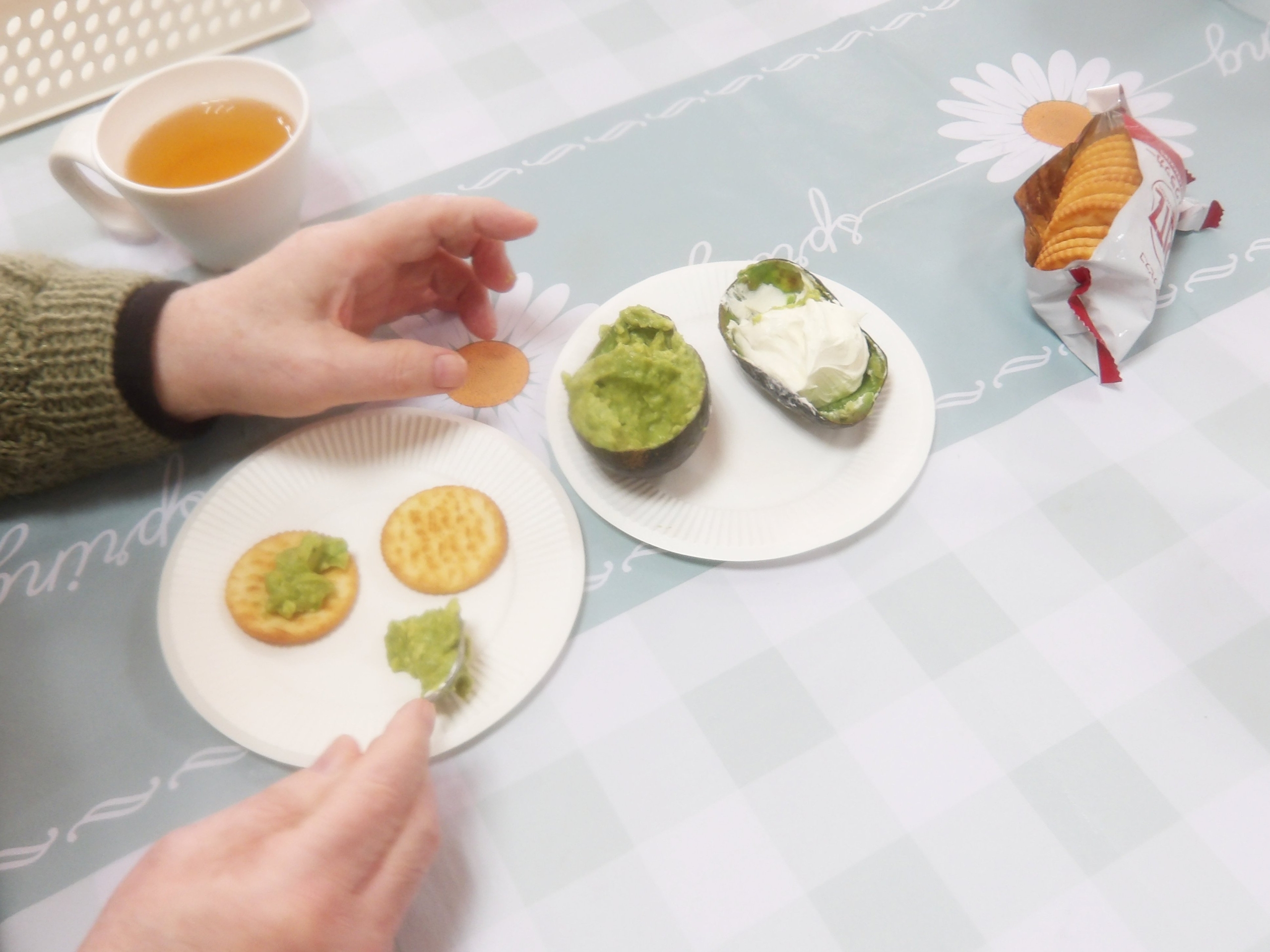 アボカドにサワークリームやヨーグルトを混ぜ、レモンと塩こしょうで味付け。クラッカーにのせて一口頬張ると、初めての味に皆さま感動されていました。