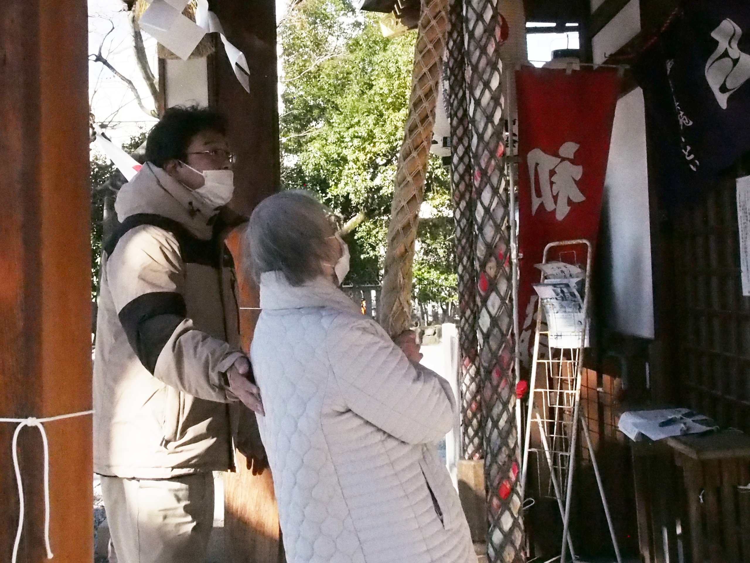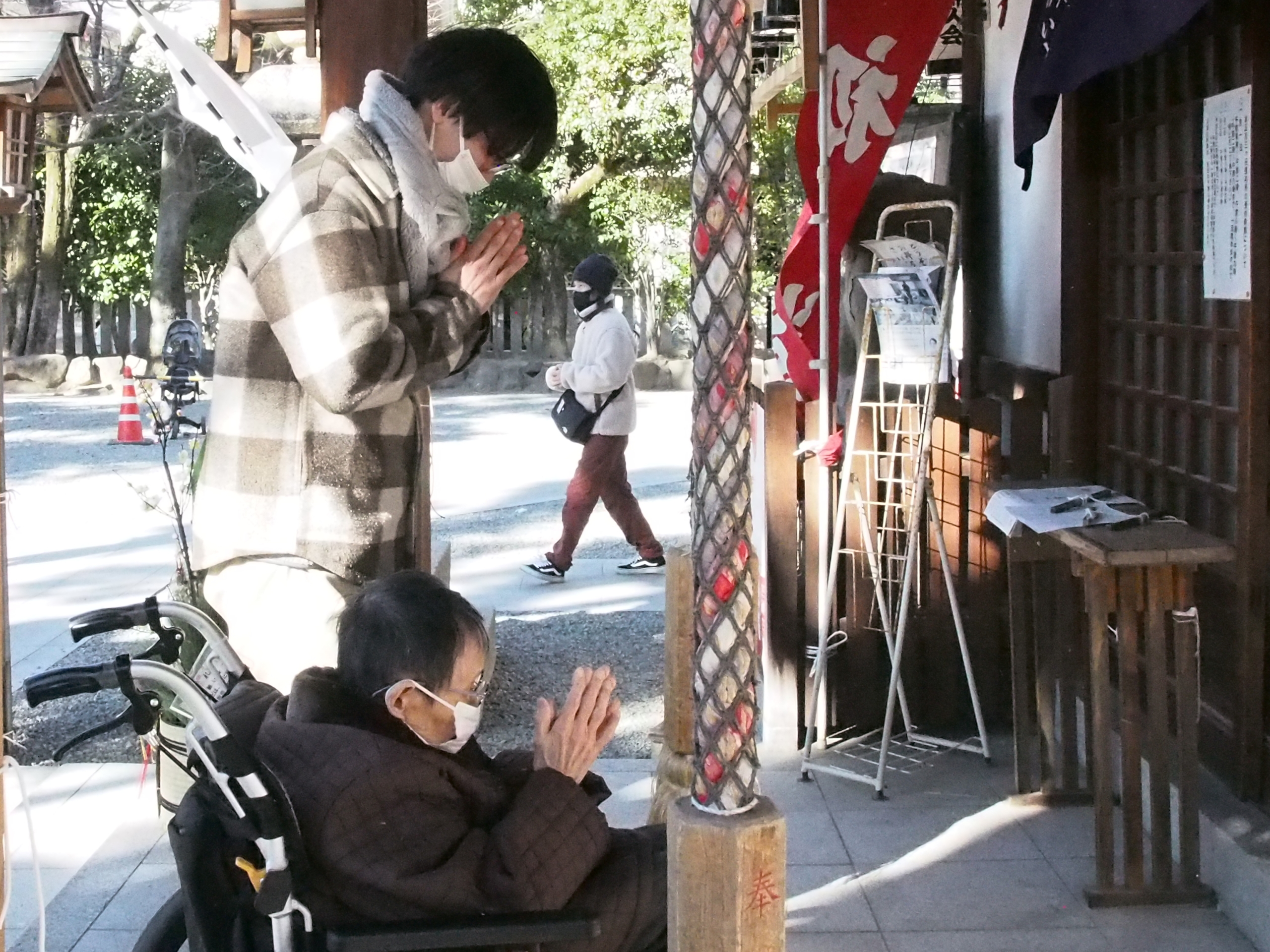 新年あけましておめでとうございます。本年もよろしくお願いいたします。1月1日から5日にかけて、三和町では近隣の神社へ初詣に行ってきました。全てのお客様をご案内することはできませんでしたが、数名ずつスタッフが付き添い、順番に参拝していただきました。皆さま熱心に手を合わせ、ご自身やご家族の健康、さらにはスタッフの健康まで願ってくださる方もおり、スタッフ一同とても感動いたしました。寒い中、ご参加いただきありがとうございました。初詣に行けなかったお客様には、施設入口に設置した門松の前で写真撮影を行いました。皆さま素敵な笑顔でポーズをとってくださいました。