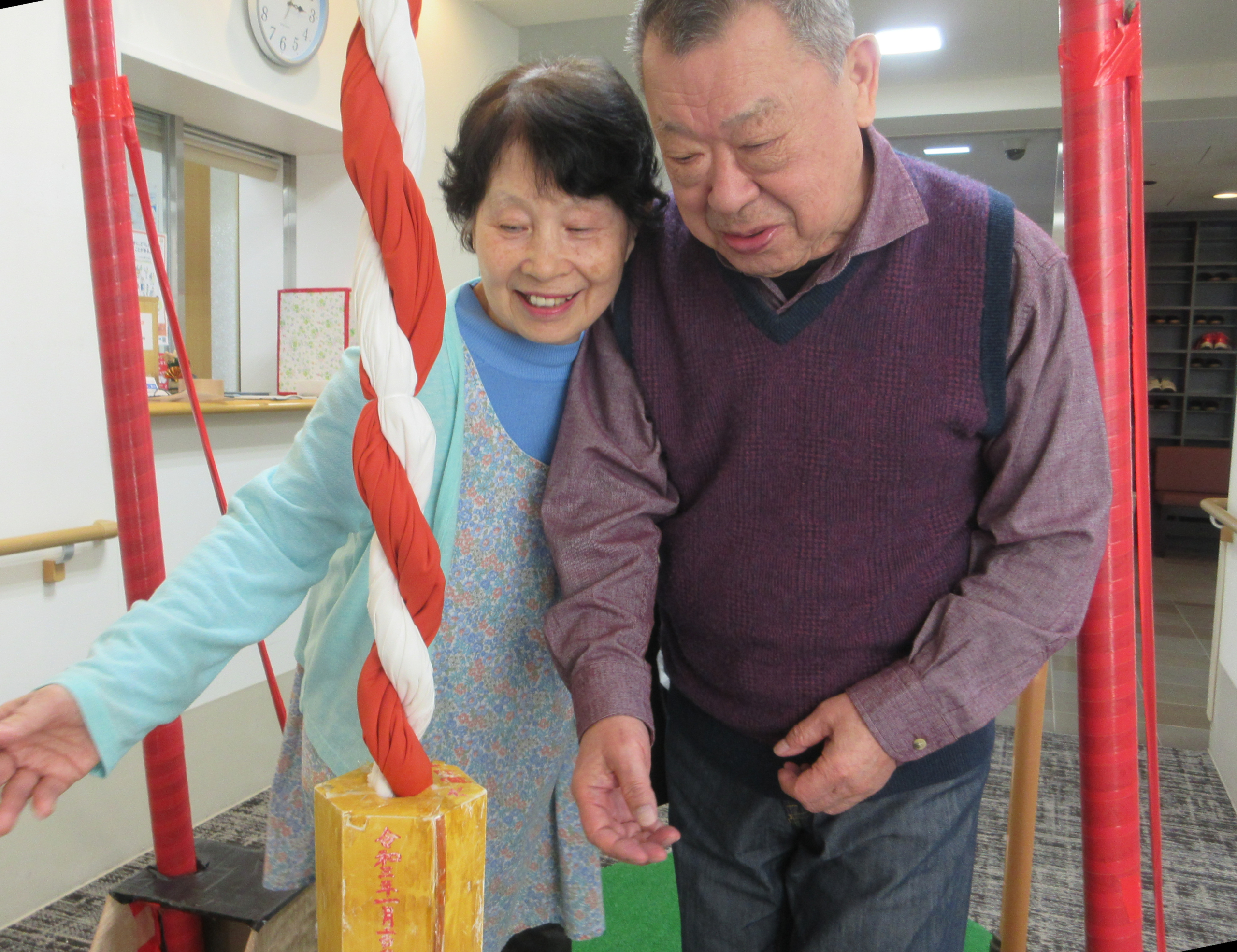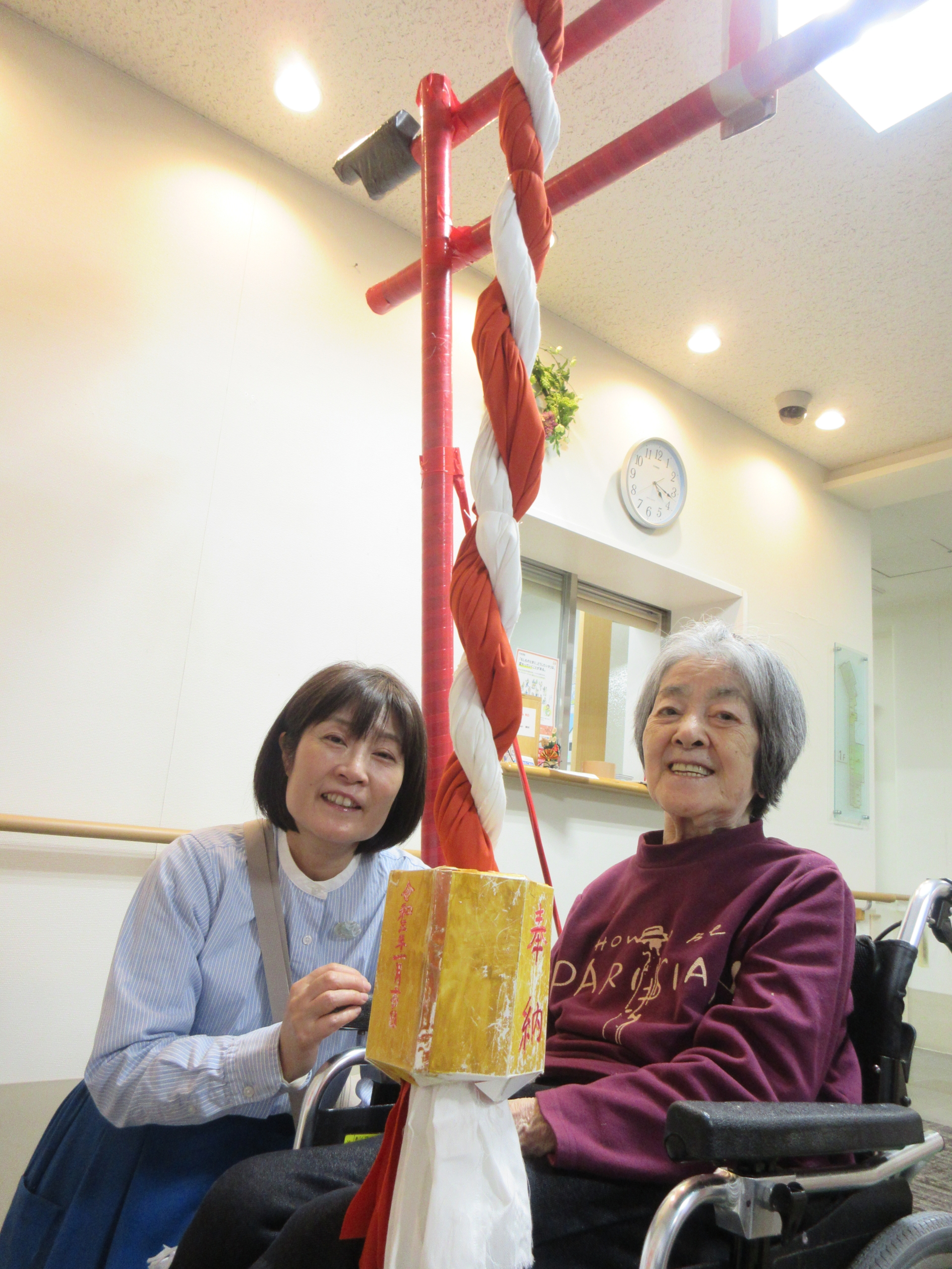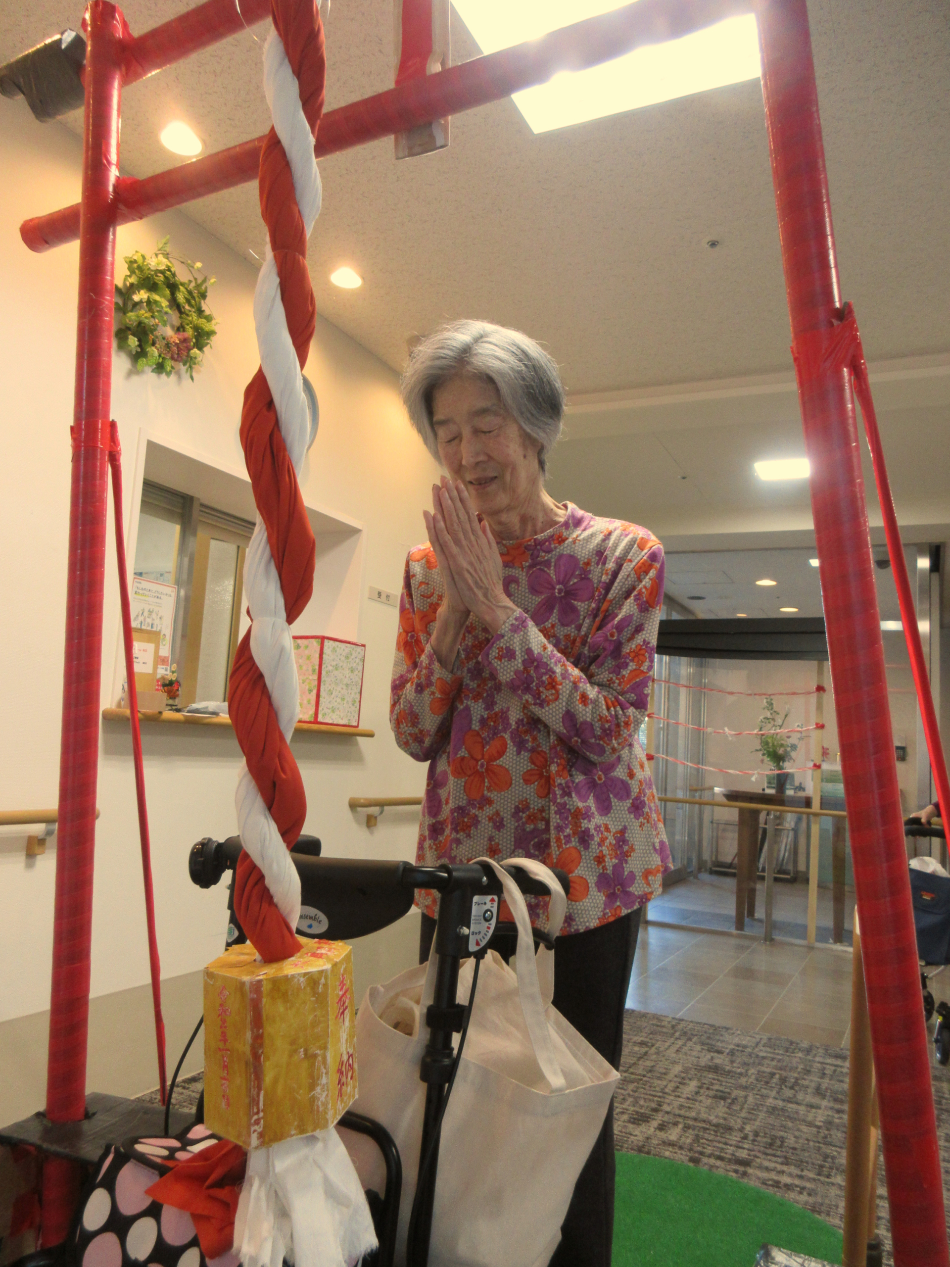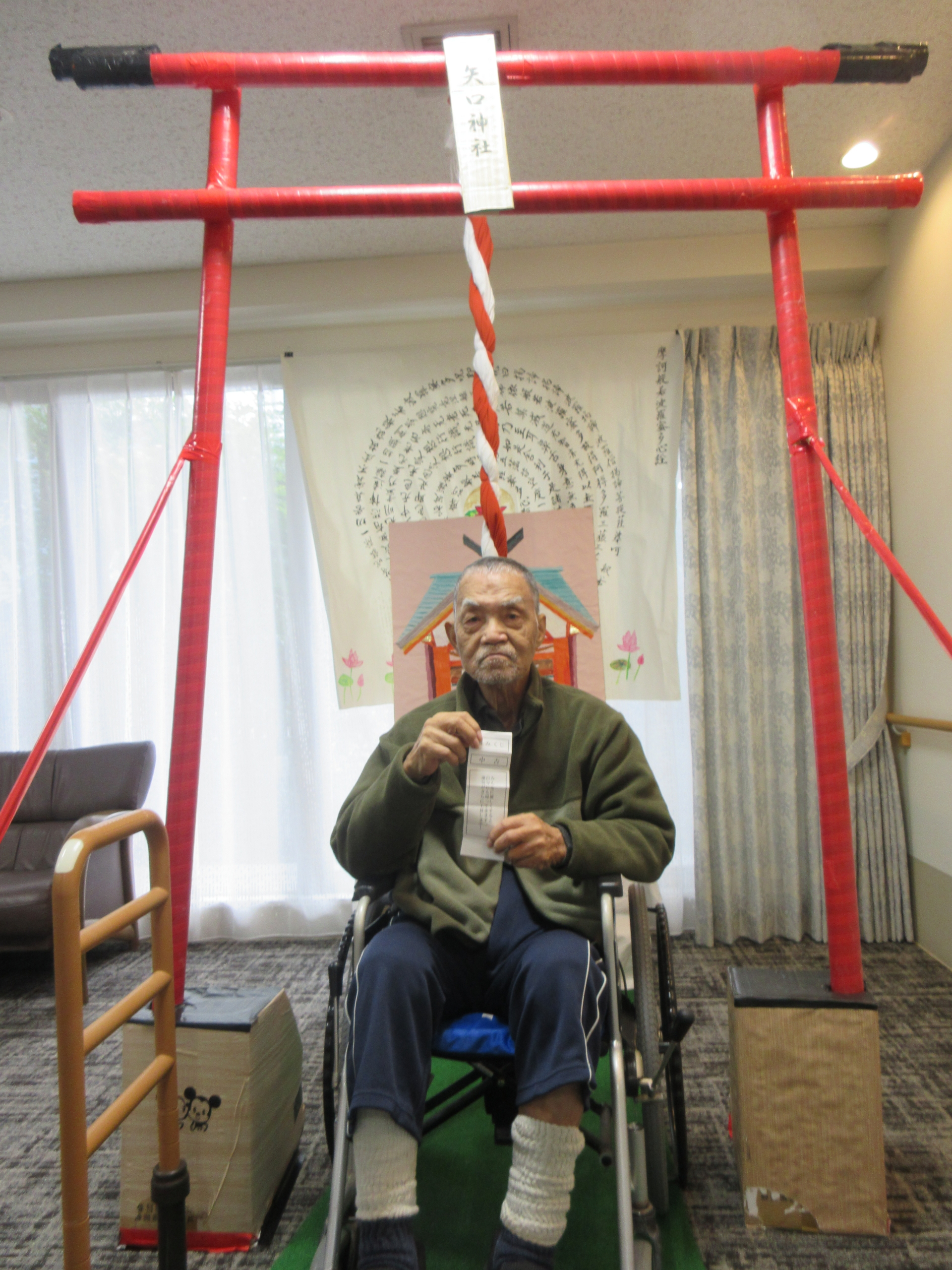 毎年恒例、お正月限定で玄関横ホールにスタッフお手製の矢口神社が建立され、皆様一生懸命にお詣りされます。その後はこれまたスタッフお手製のおみくじを引いて今年一年の運だめし。面会に来られたご家族も一緒に素敵な笑顔で新年を迎えました。
