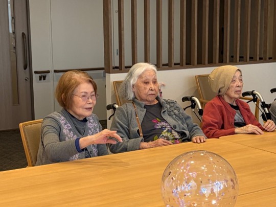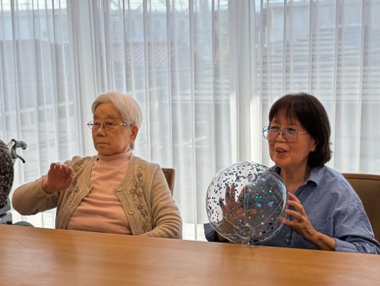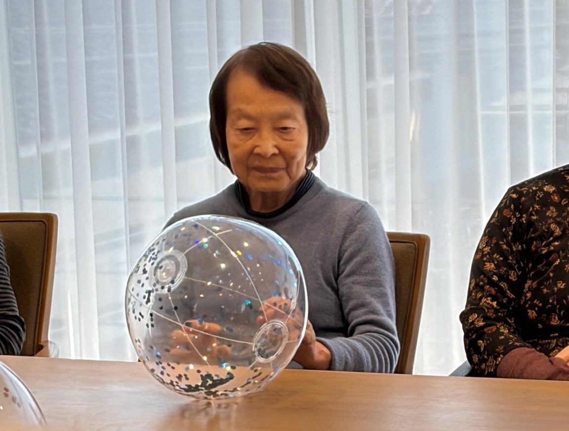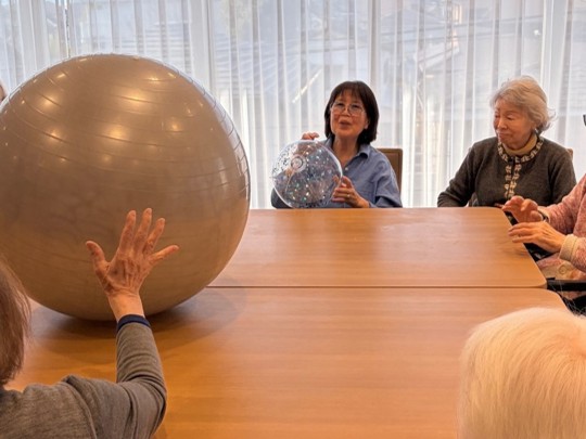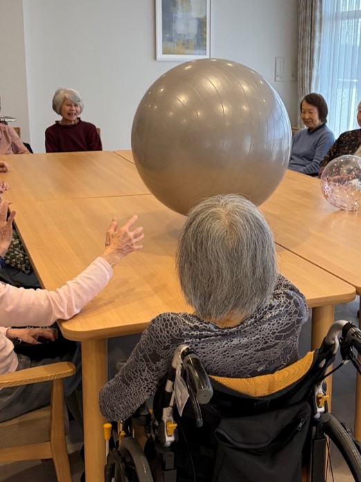 風船バレーを行いました。小さなボールと大きなボールを使い、ボールが手元に来ると皆さま上手にキャッチして前の方へパスされていました。