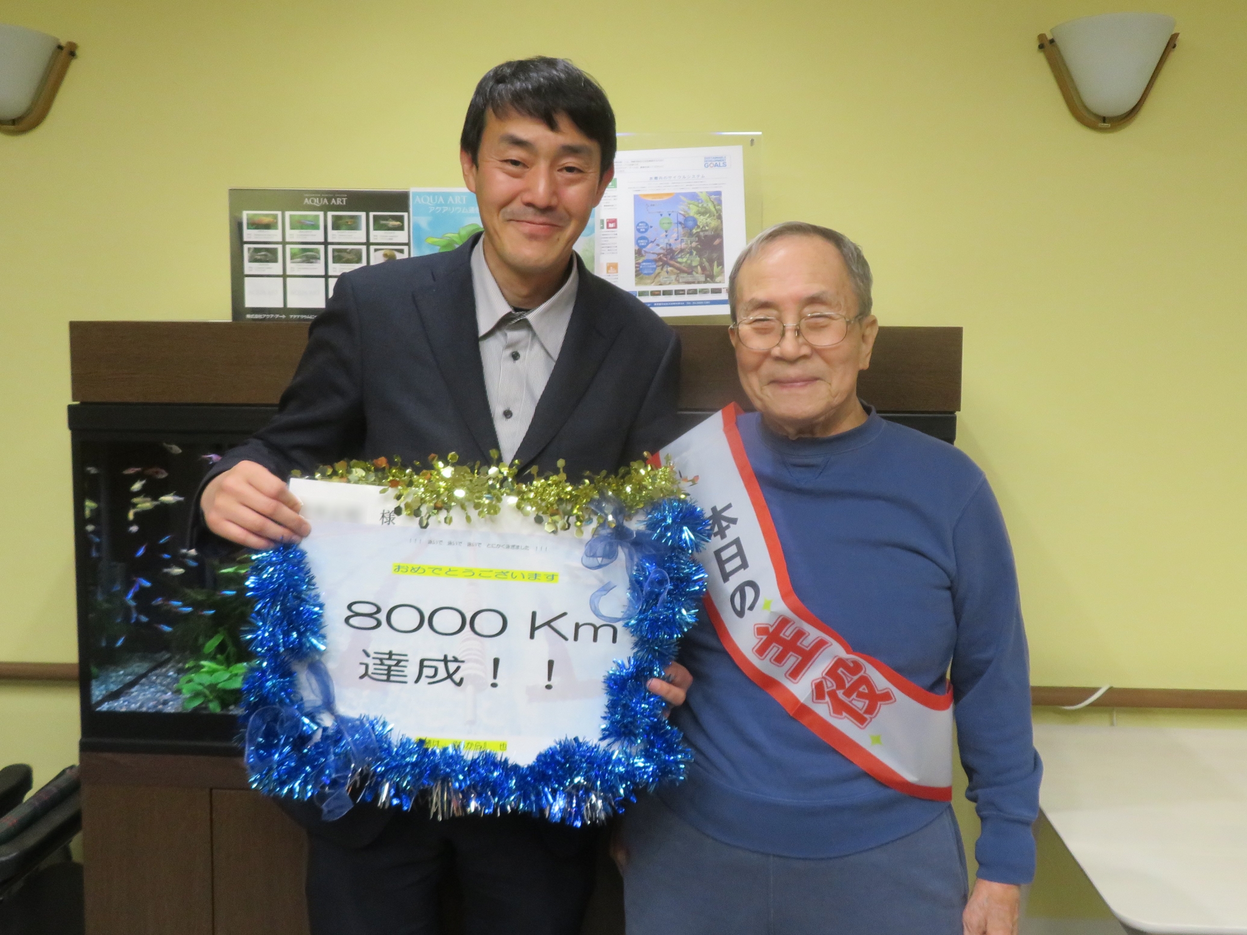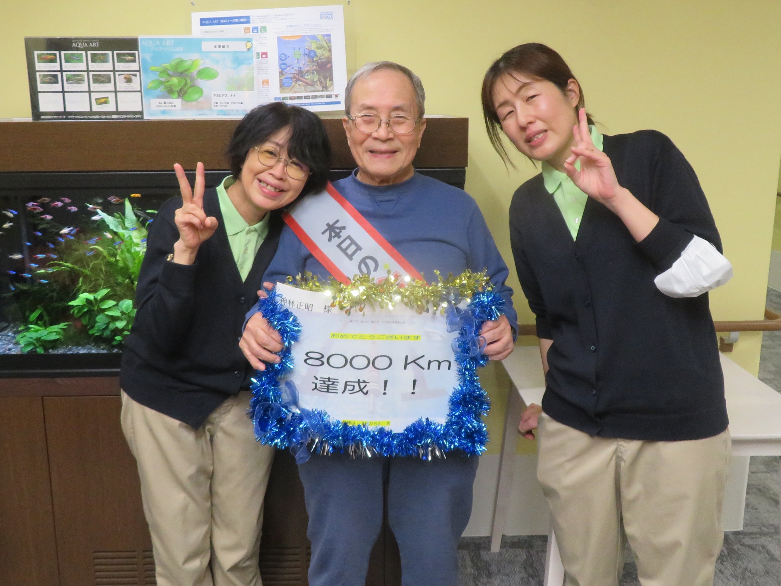 生涯スポーツとして水泳を続けてこられたご入居者様。83歳の時に「10年で1,000キロ泳ぐ」という目標を立てられ、今年ついに8,000キロを達成されました。ホームのみんなで、お祝いしました。