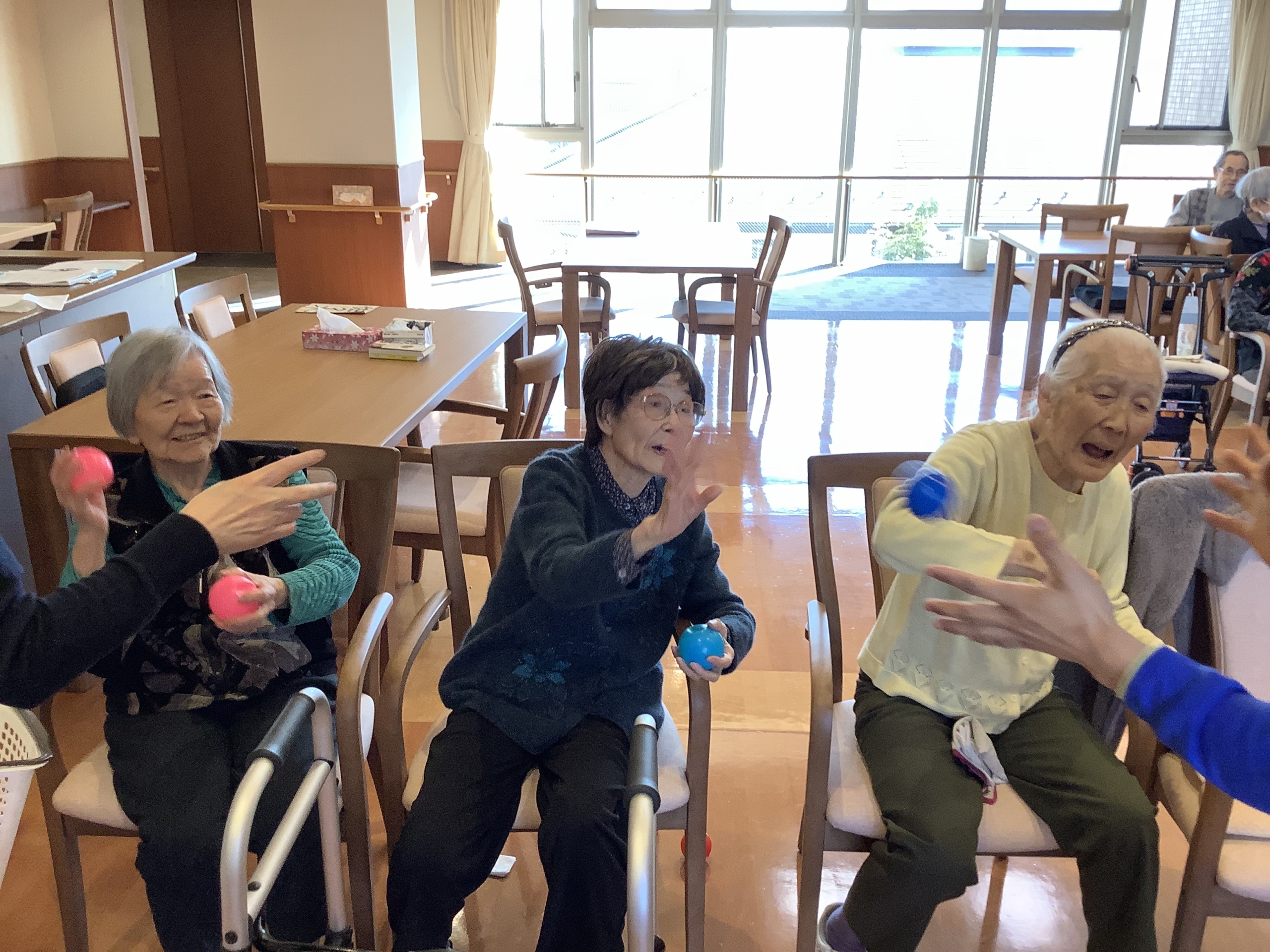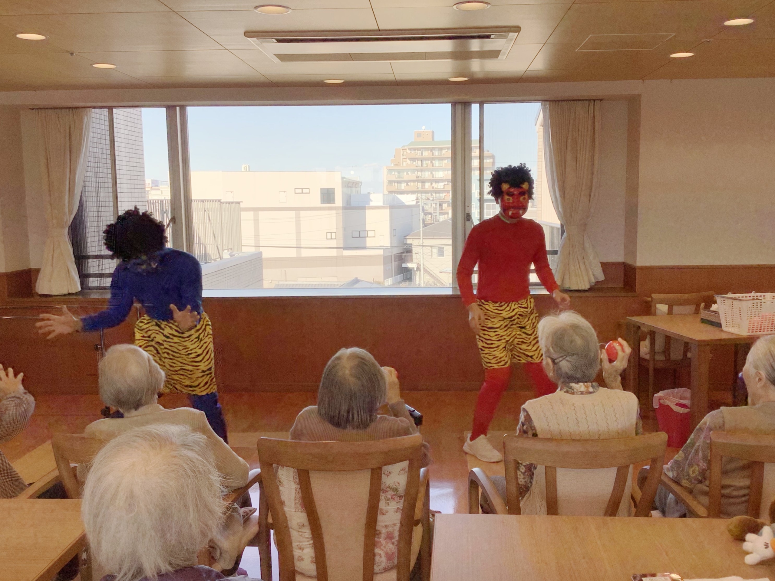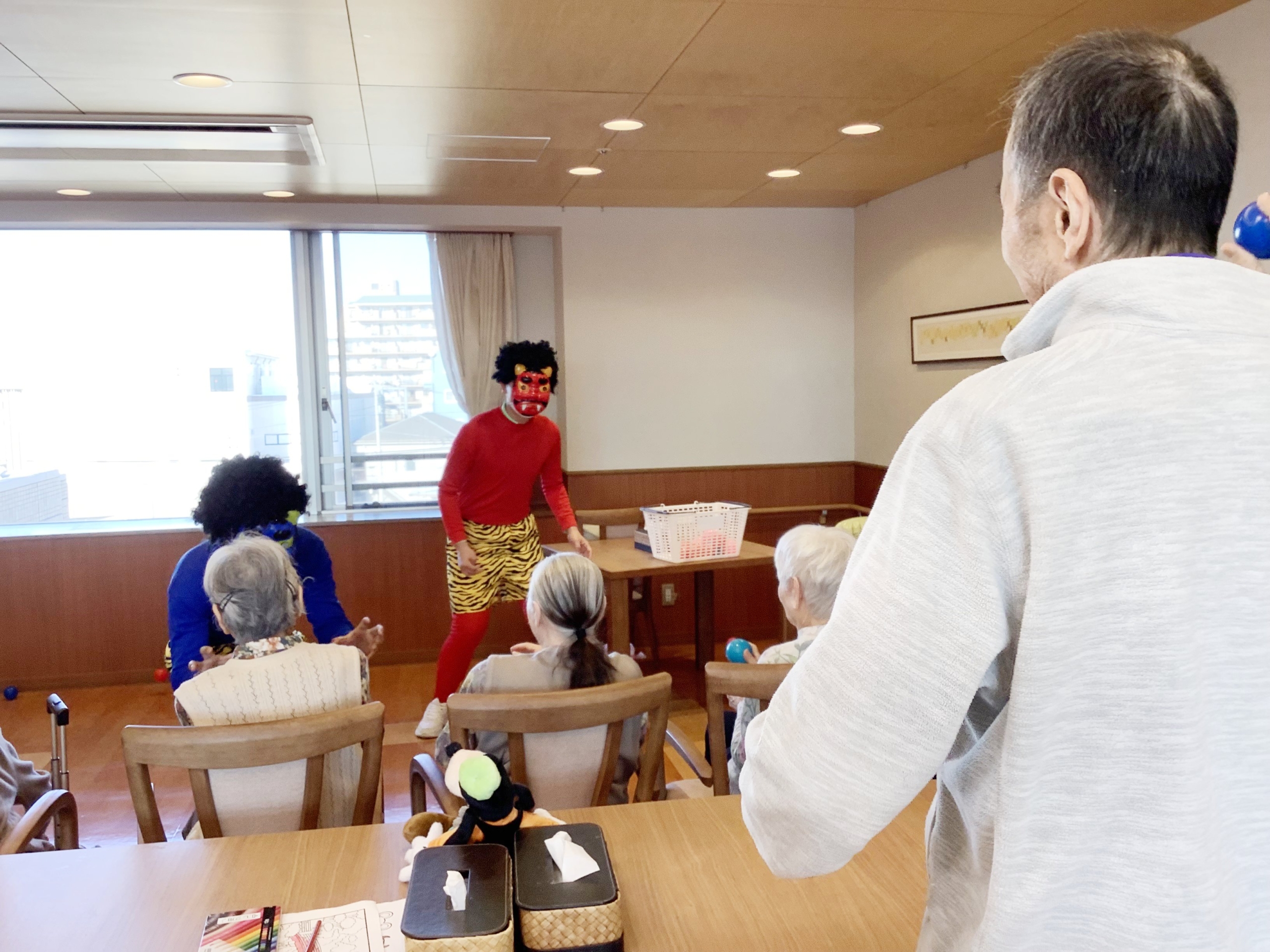 ホームにも青鬼と赤鬼がやってきました。皆さんは無病息災を願い、「鬼は外、福は内!」の掛け声とともに、豆に見立てたボールを元気に投げて鬼退治。今年もよい一年になりそうです。