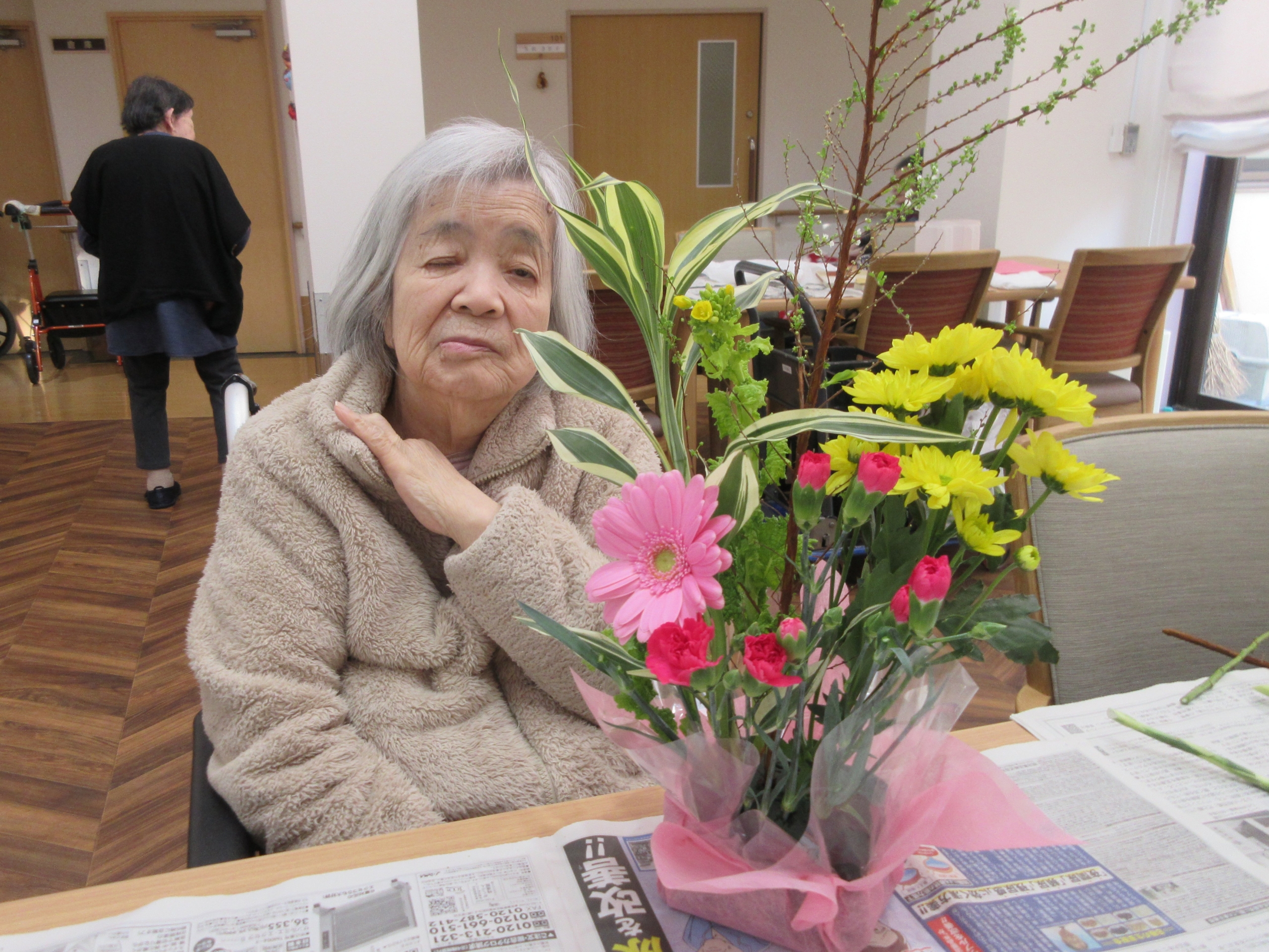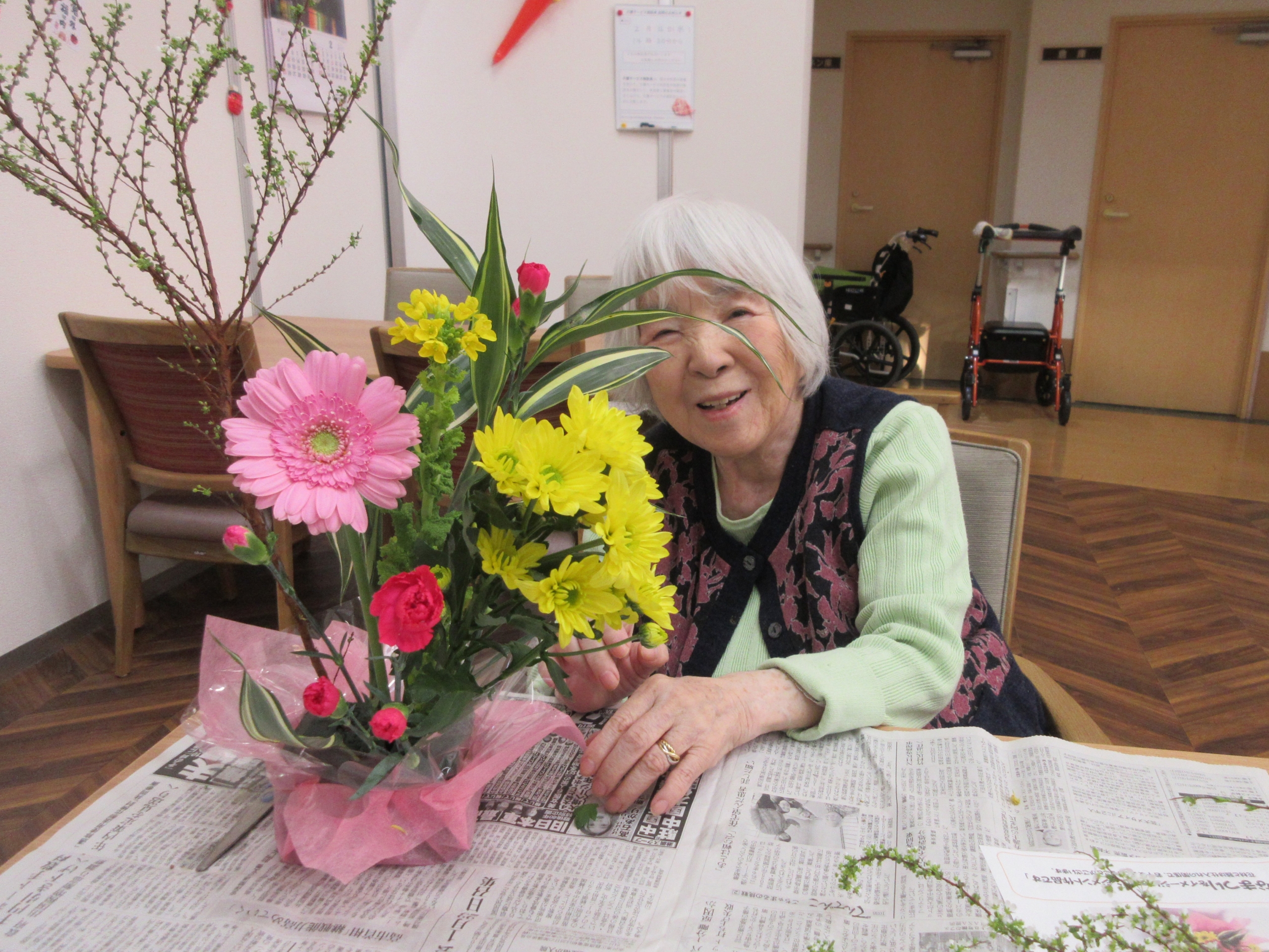 今回のテーマは桃の節句。ピンクを基調にした華やかなアレンジメントを楽しんでいただきました。雪柳や菜の花、ガーベラ、スプレーカーネーション、スプレーマムなど、春らしい花々がそろい、「いい香りねえ」と笑顔もこぼれます。