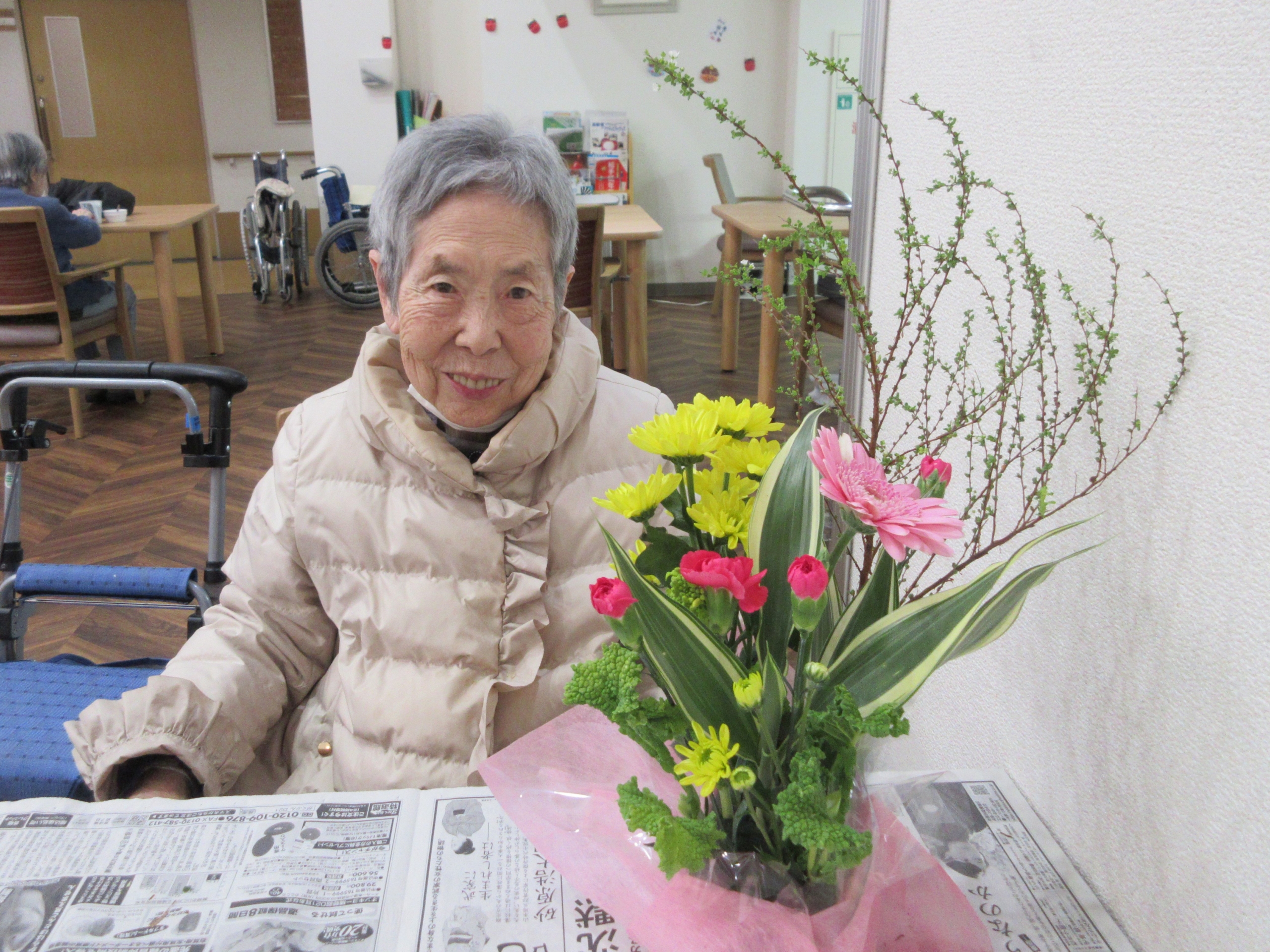 ピンクと黄色のやさしい色合いに「可愛くて、毎月楽しみです」とのお声も。スプレーマムの花言葉が「清らかな愛」とお伝えすると、「私たちのことね」と顔を寄せ合って微笑まれていました。季節の花の色や香りを感じながら、和やかな時間を過ごしていただきました。