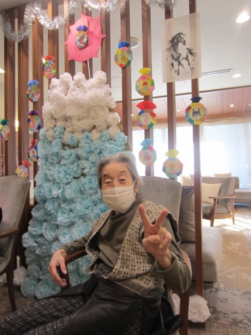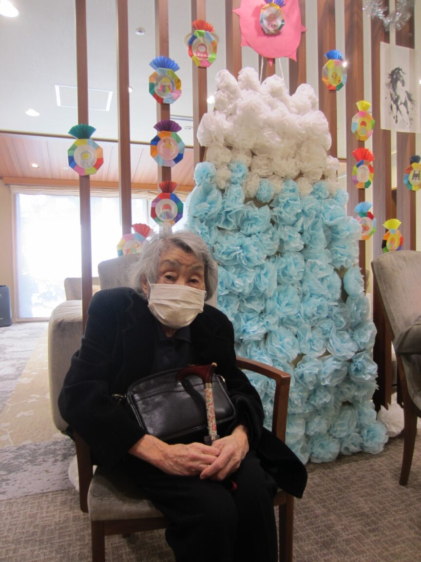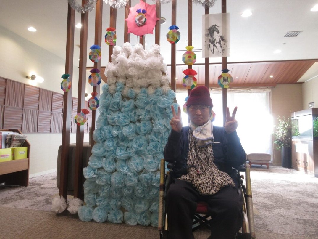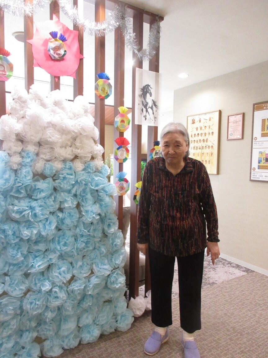 ニチイホーム用賀では、1階エントランスに季節ごとの飾りを展示しています。1月は紙のお花で富士山をイメージした作品を飾りました。作成にご協力いただいた皆様と記念撮影も行い、和やかなひとときとなりました。2月はどんな飾りになるか楽しみです。