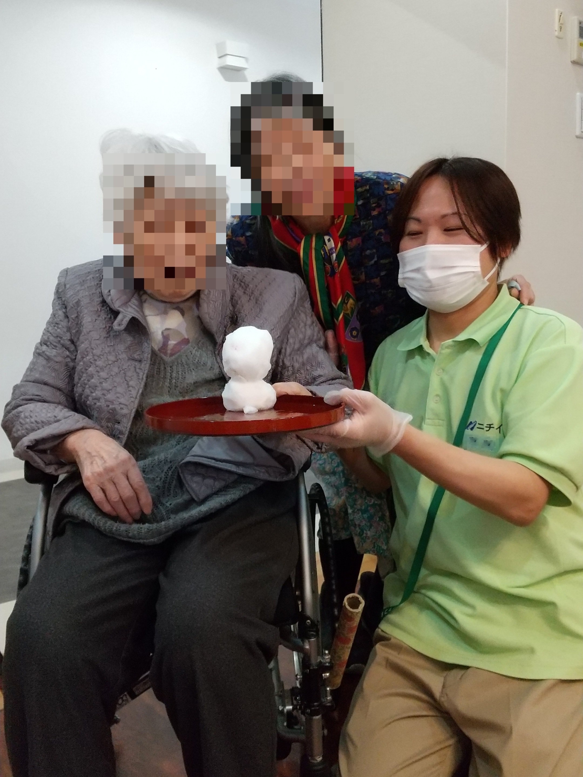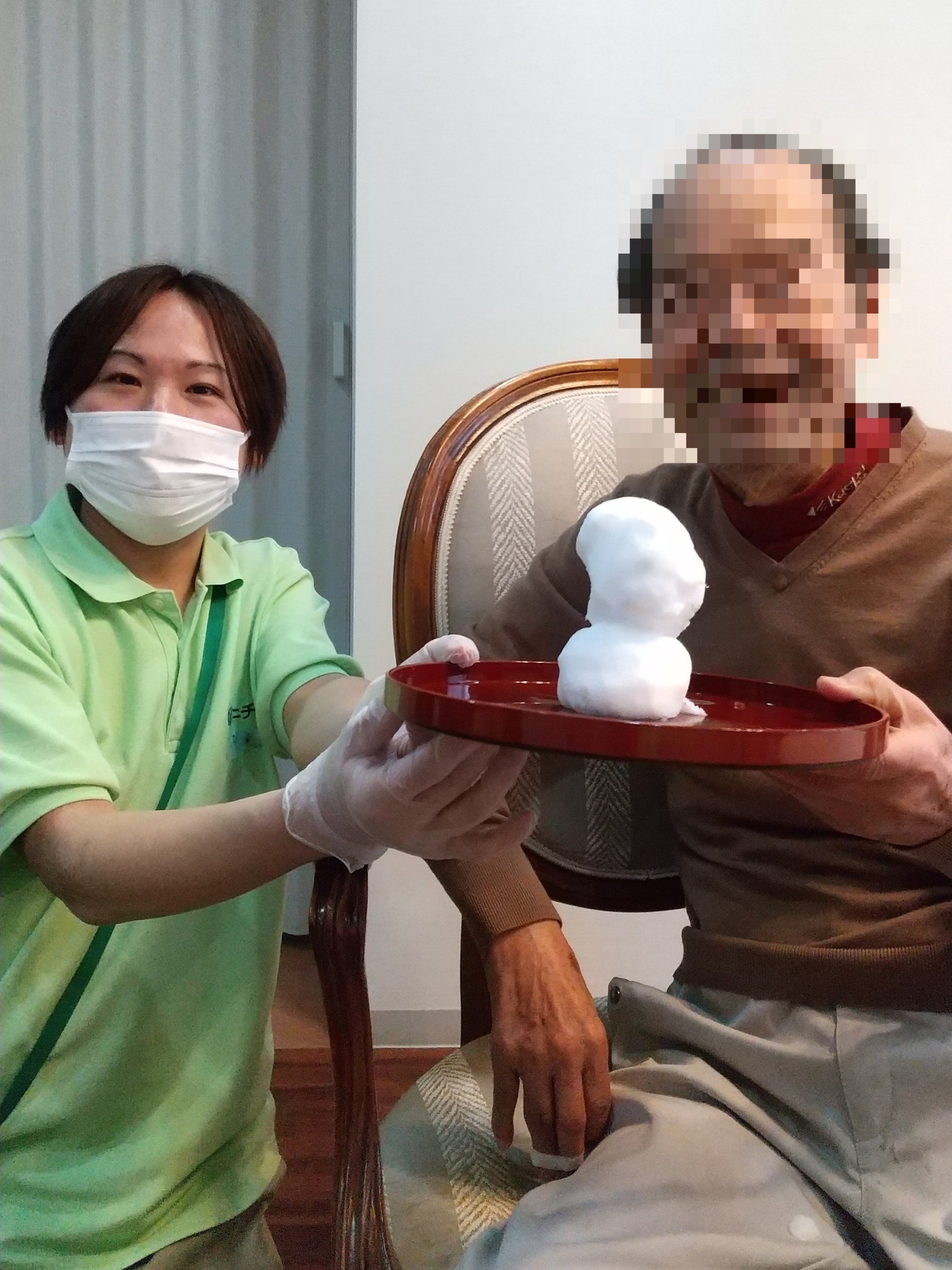 久しぶりに雪が積もりました。スタッフも思わず気持ちが高まり、雪だるまを作ってお客様のもとへお届けしました。