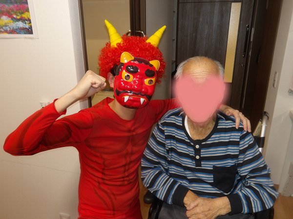 ニチイホーム南大井の節分では、赤鬼と青鬼の2体の鬼が登場し、お客様全員で元気よく退治していただきました。鬼の登場には驚きの声や笑い声があがり、会場は大盛り上がり。
