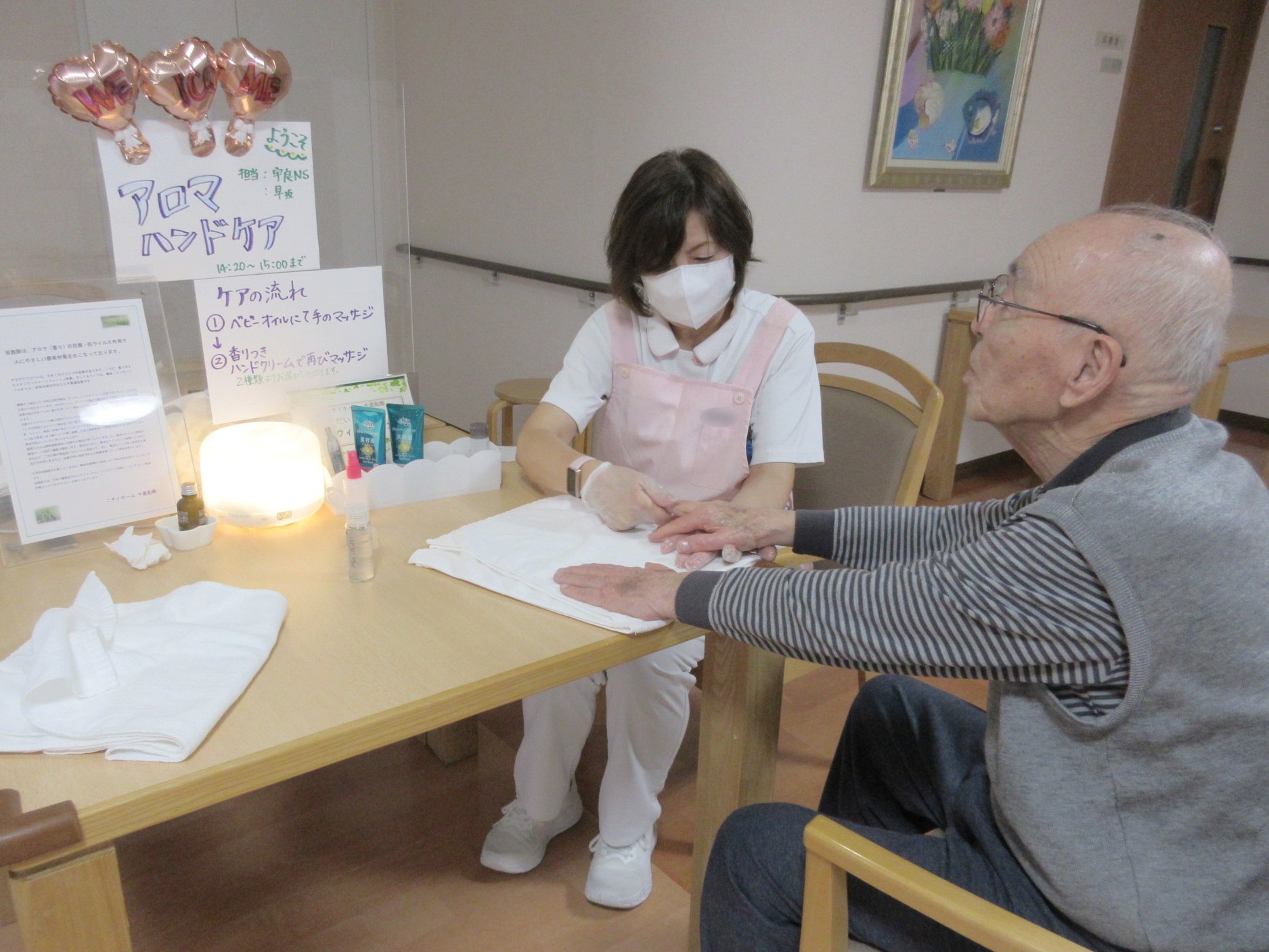 アロマハンドケアを行いました。やさしい香りとマッサージで、心地よい時間を過ごしていただきました。