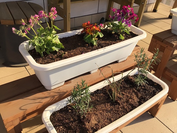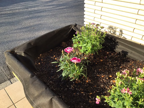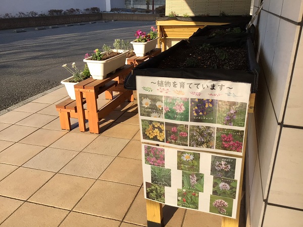 ホームの玄関に花壇とプランターを設置し、季節の花やハーブを植えました。