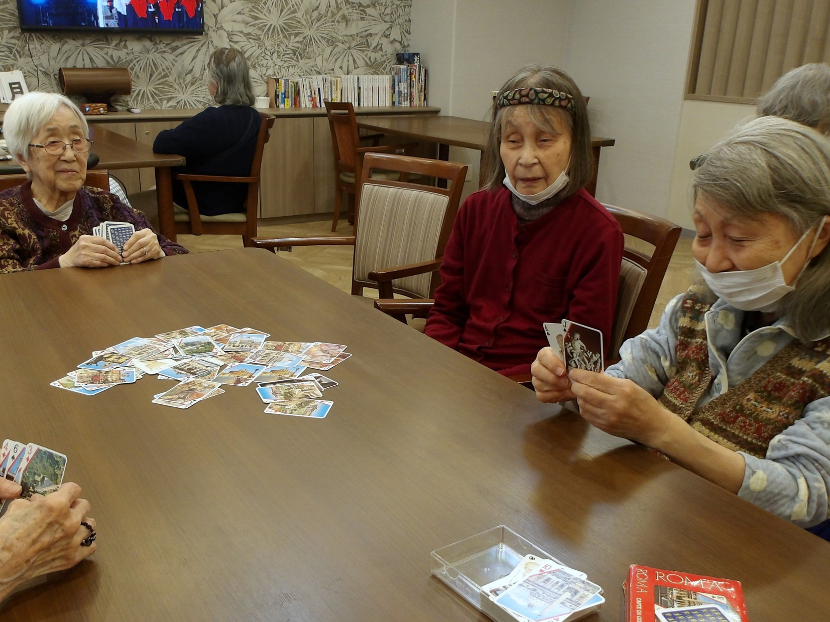 トランプのババ抜きで大いに盛り上がりました。「懐かしいわね」「どうやるんだっけ?」「この柄きれいね」など、皆さまから次々と声が上がり、スタッフもお手伝いをしながら会話が弾む楽しい時間となりました。 笑顔と温かい交流が広がる、和やかなひとときでした。
