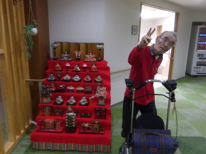 ホームにひな人形を飾りました。華やかに並んだひな人形を背景に、皆さまで写真撮影を行い、「立派なひな人形だね」と喜ばれる姿が見られました。