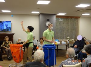 ホーム食堂でミニ運動会を開催しました。皆さん童心に帰り、玉入れやボール送りで大いに盛り上がりました。楽しそうな笑顔がたくさん見られ、素敵なひとときを過ごしていただきました。
