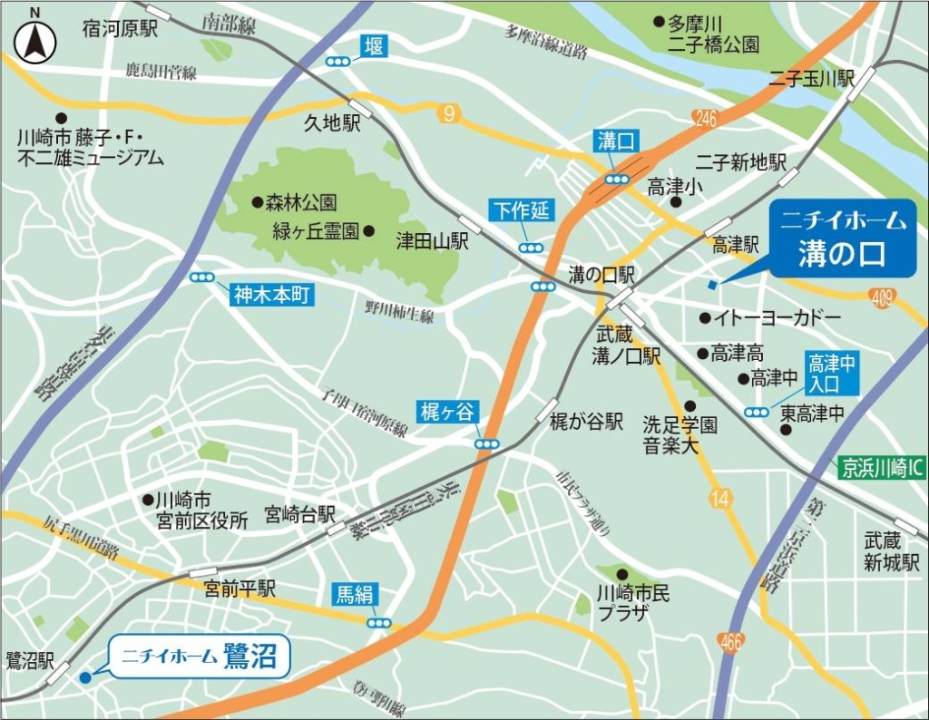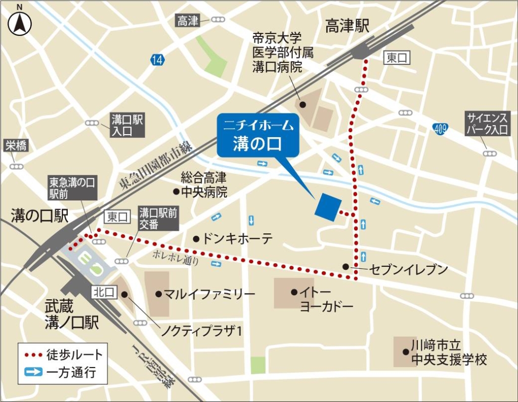 - 東急田園都市線「高津」駅東口より徒歩6分(約450m)