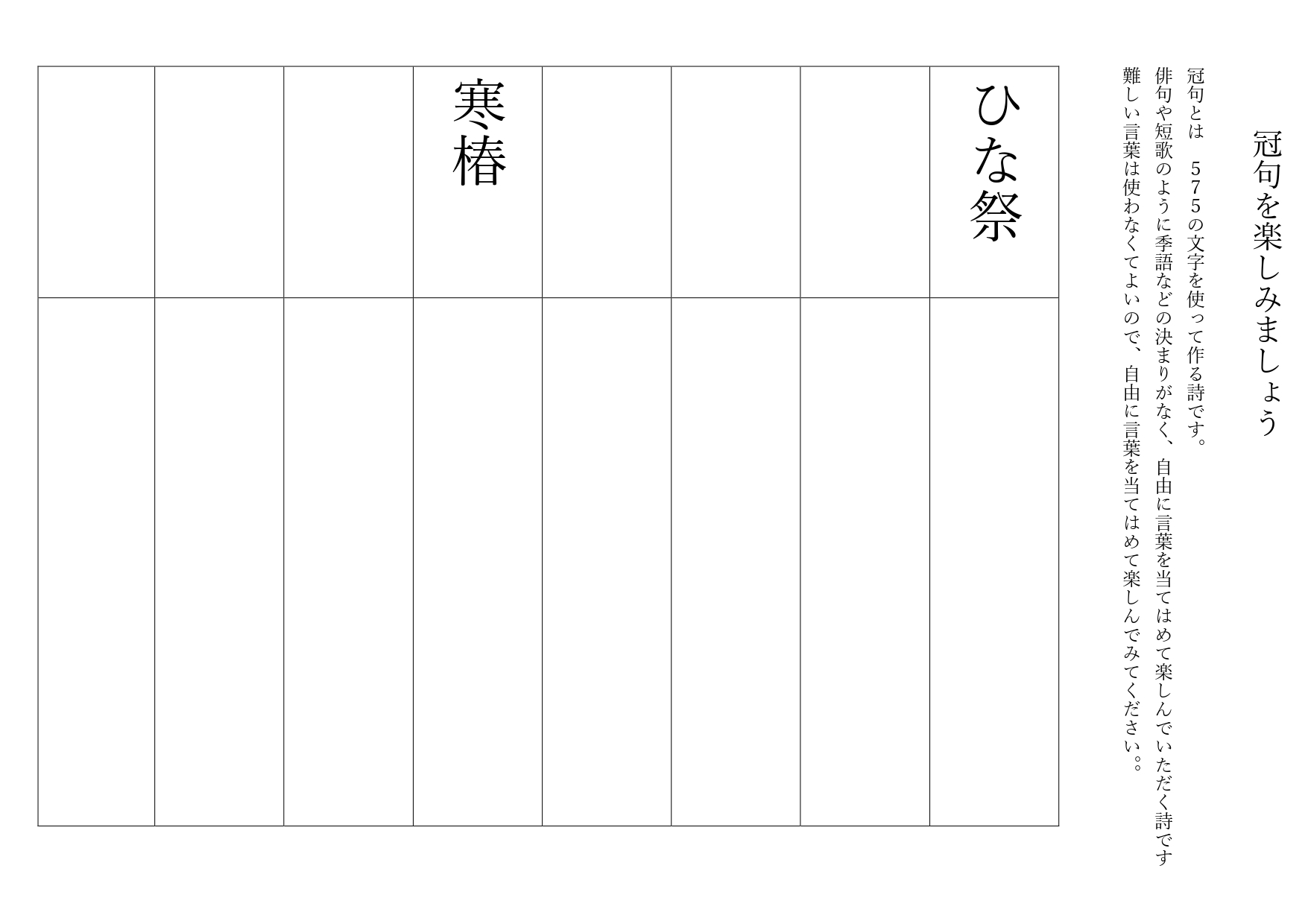 冠句の会をはじめました。冠句とは、五・七・五の文字数で作る詩のこと。俳句や短歌のような季語などの決まりはなく、自由に言葉を当てはめて楽しめるのが魅力です。難しい言葉を使わなくても大丈夫。思いついた言葉で、気軽にご参加ください。
