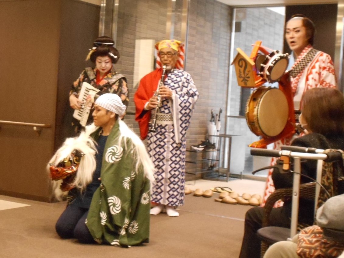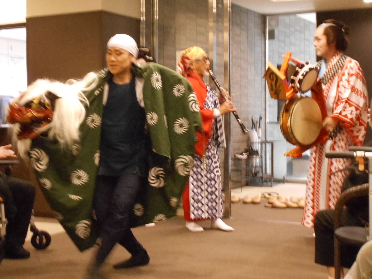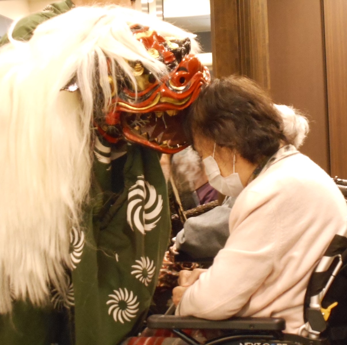 毎年新年の恒例行事である獅子舞が、今年もやってきてくれました。獅子の舞を鑑賞した後は、お集まりのお客様お一人おひとりが獅子に頭を噛んでもらい、邪気払いを行いました。