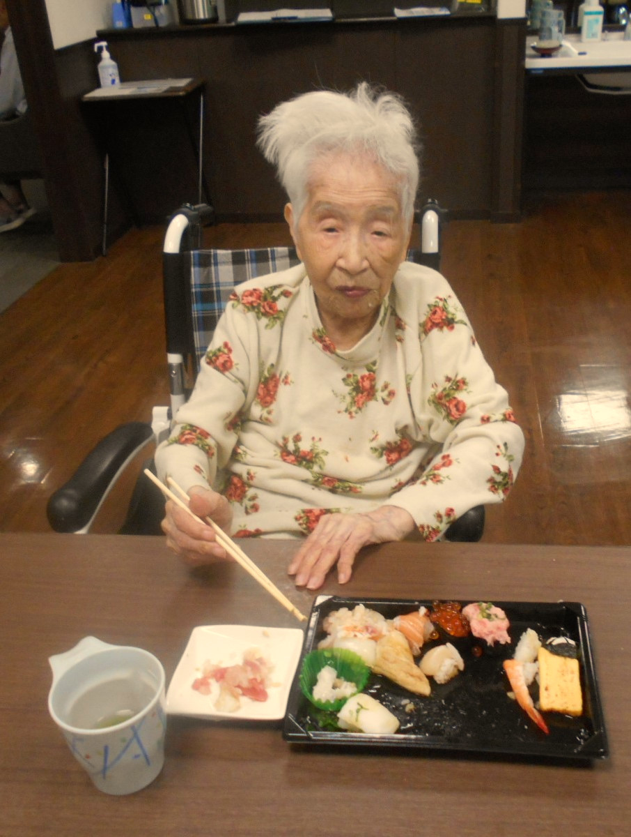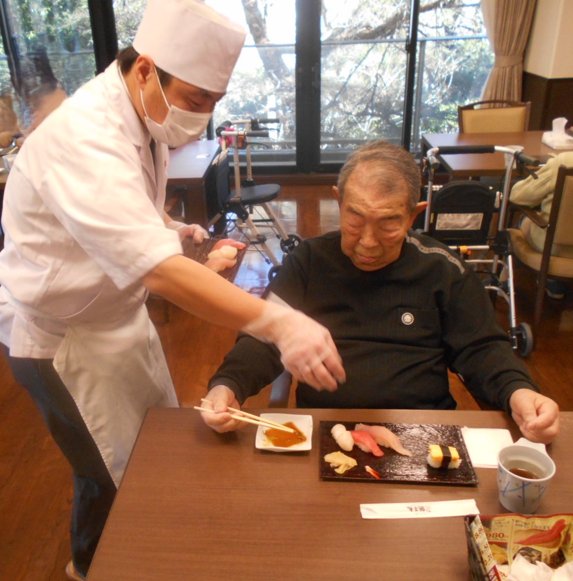 今回は銚子丸さんをお迎えし、出張お寿司イベントを開催しました。多くのお客様が参加をご希望され、皆さん口を揃えて「美味しい」と大絶賛でした。お客様の食事の形態に合わせて、細かく刻んで丼にしたり、一口大に加工して頂き、普段なかなかお寿司を召し上がられないお客様も楽しんでおられました。食べ終わった後に早速また食べたいとの声を頂戴いたしました。