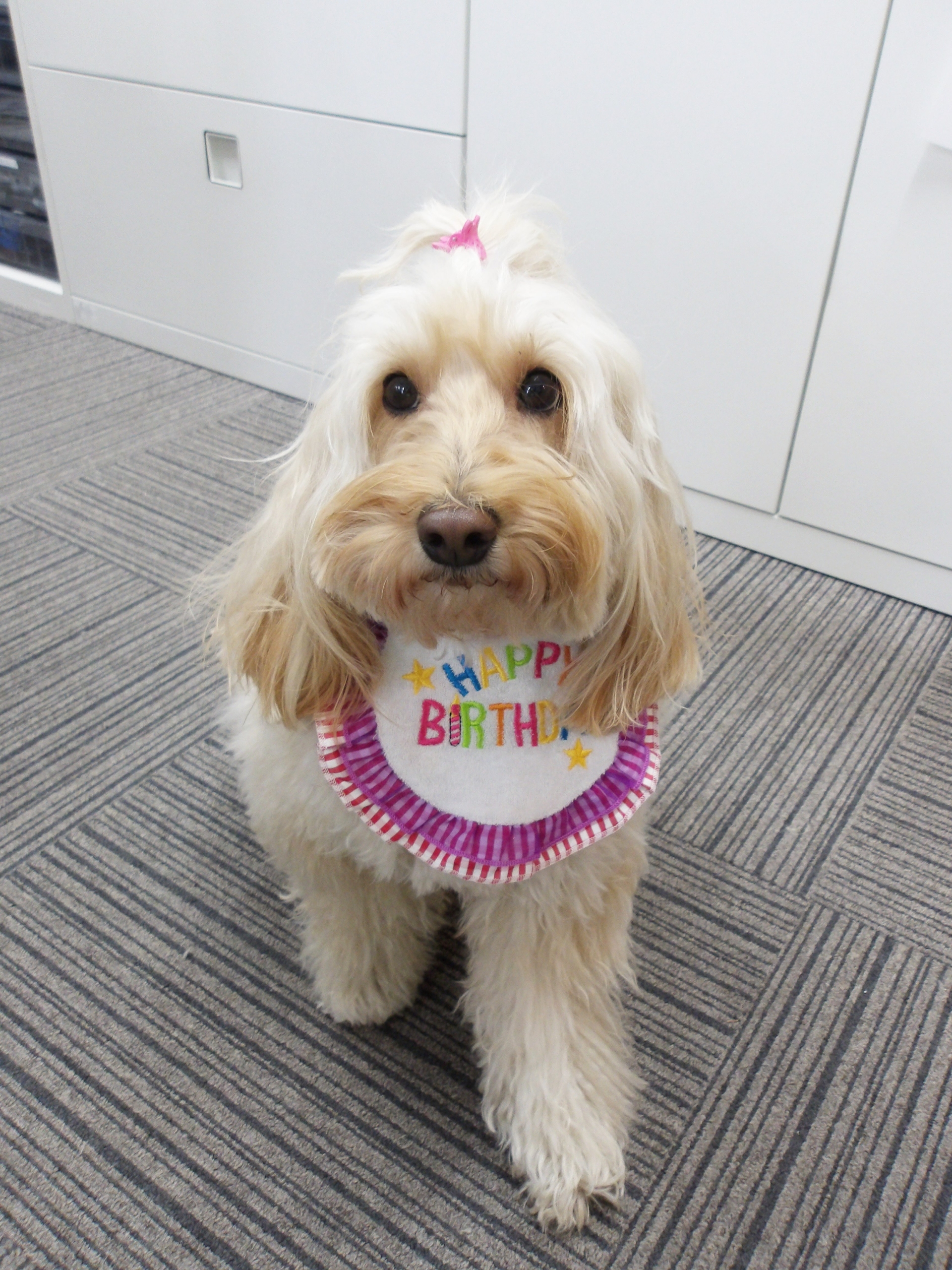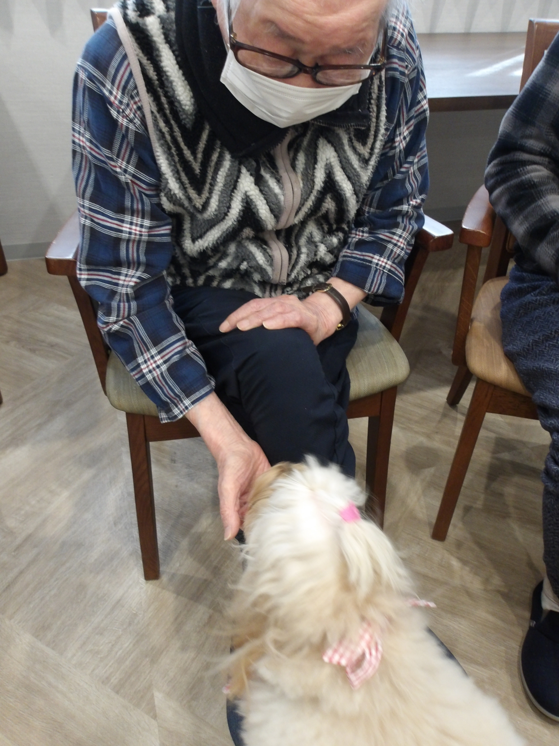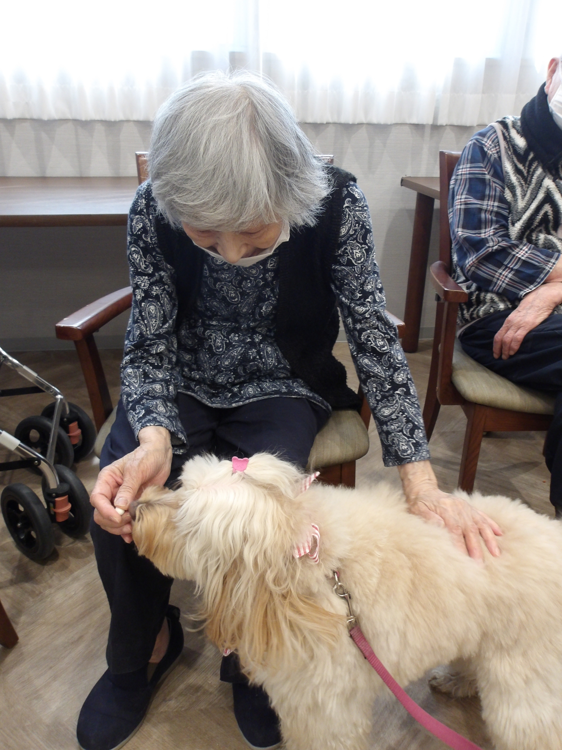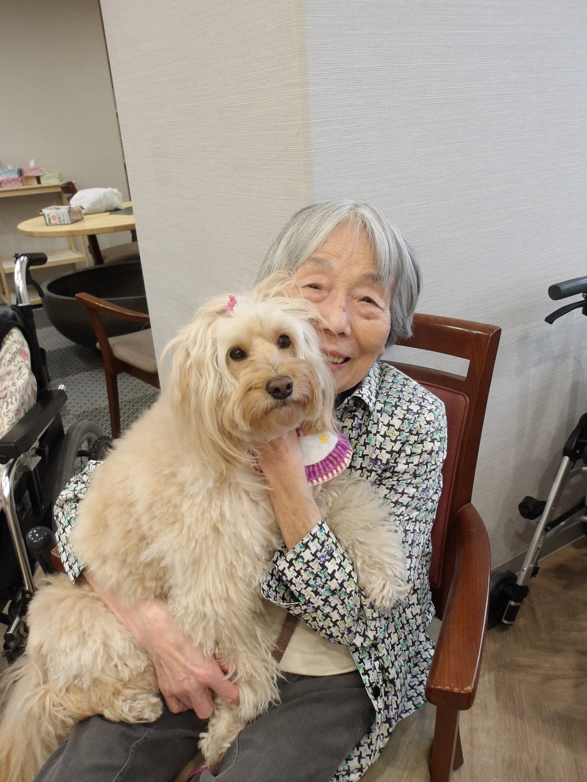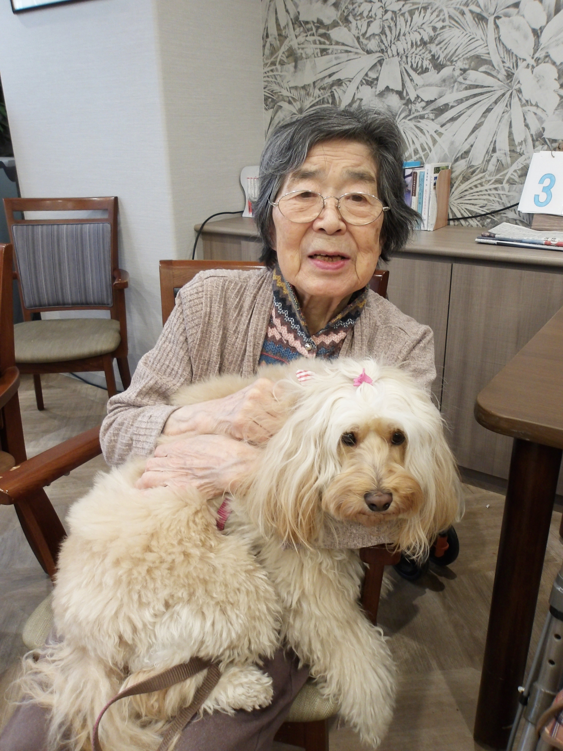 3月7日は、セラピー犬アミの7回目のお誕生日でした。少しおめかしをして、お客様が集まるリビングへご挨拶に伺いました。
