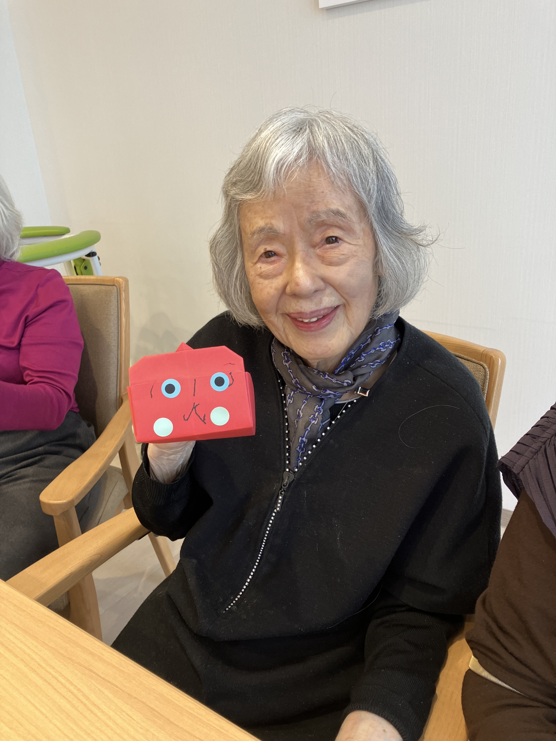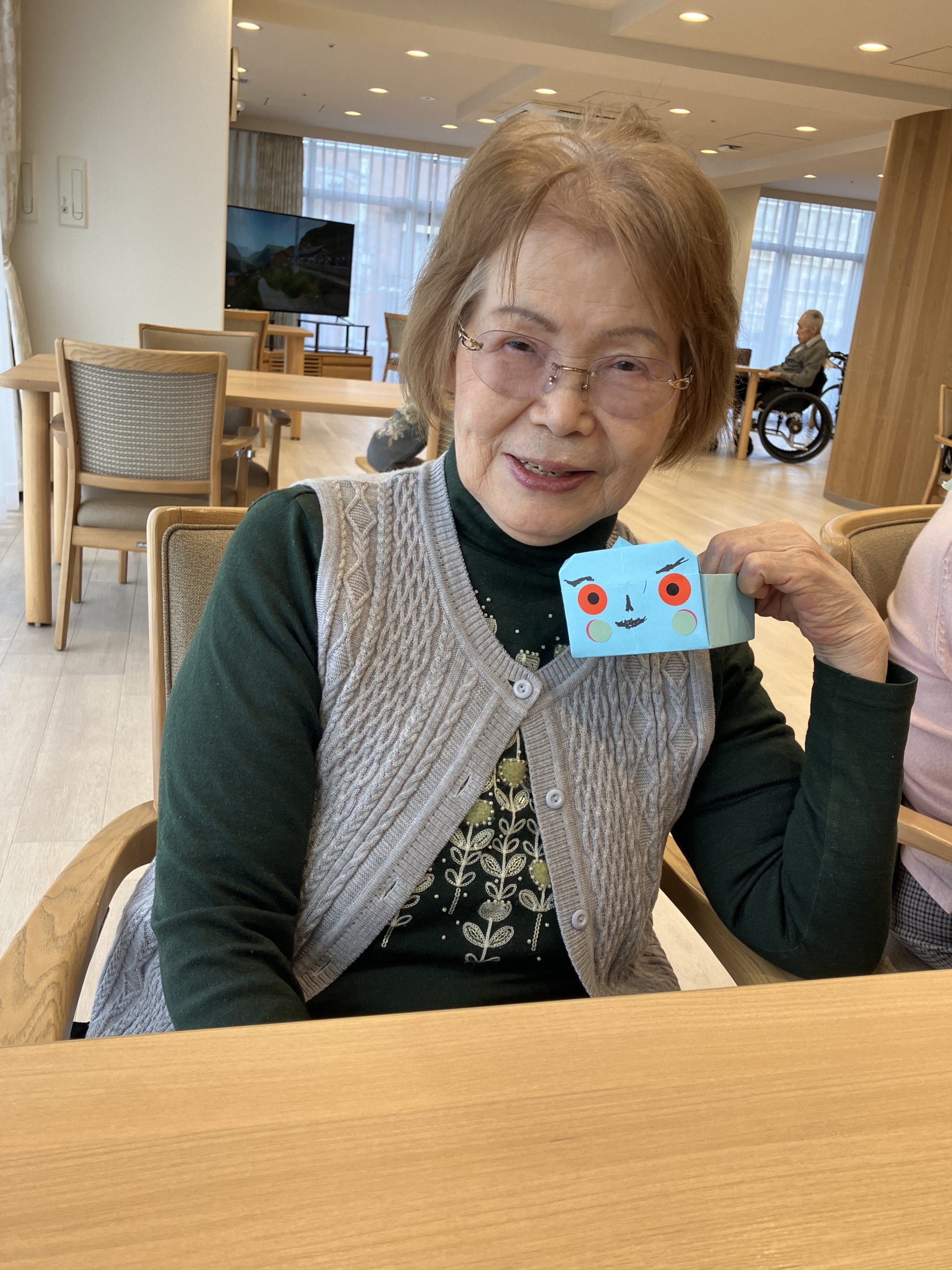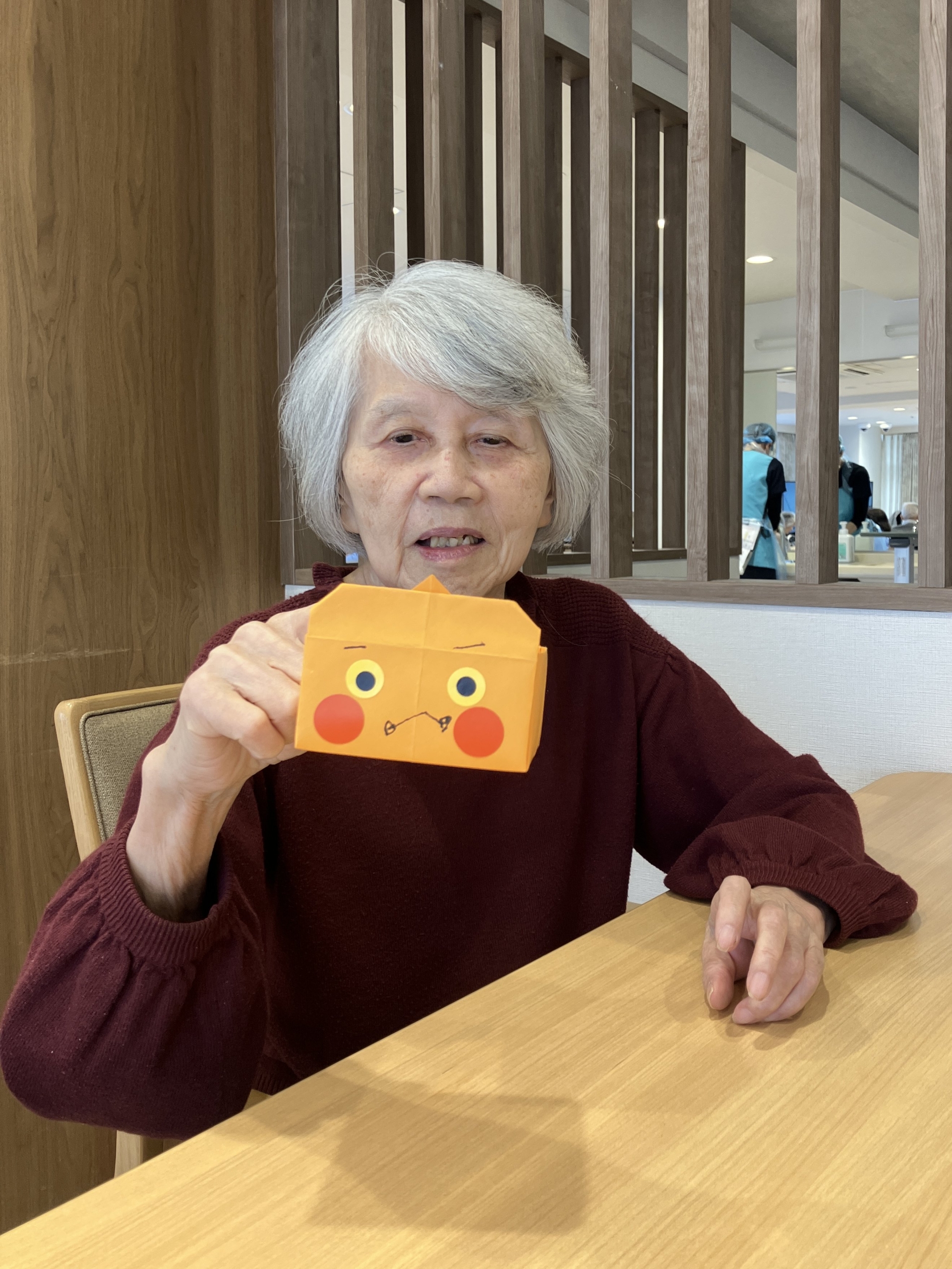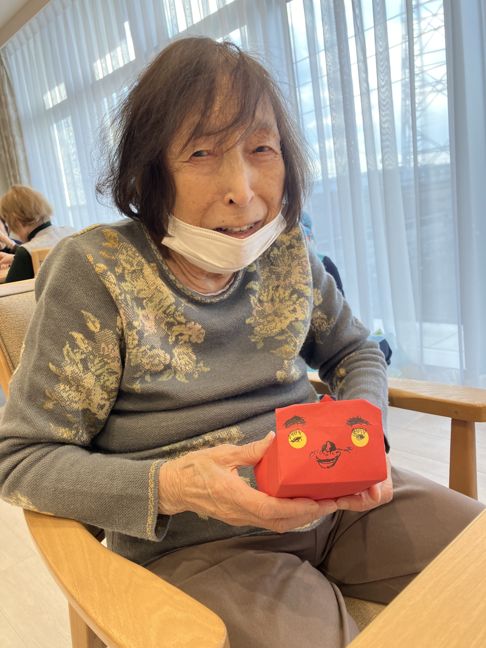 節分に向けて、豆を入れる「ます」を工作しました。各自が好きな顔を自由に描き、個性豊かな表情が並びました。