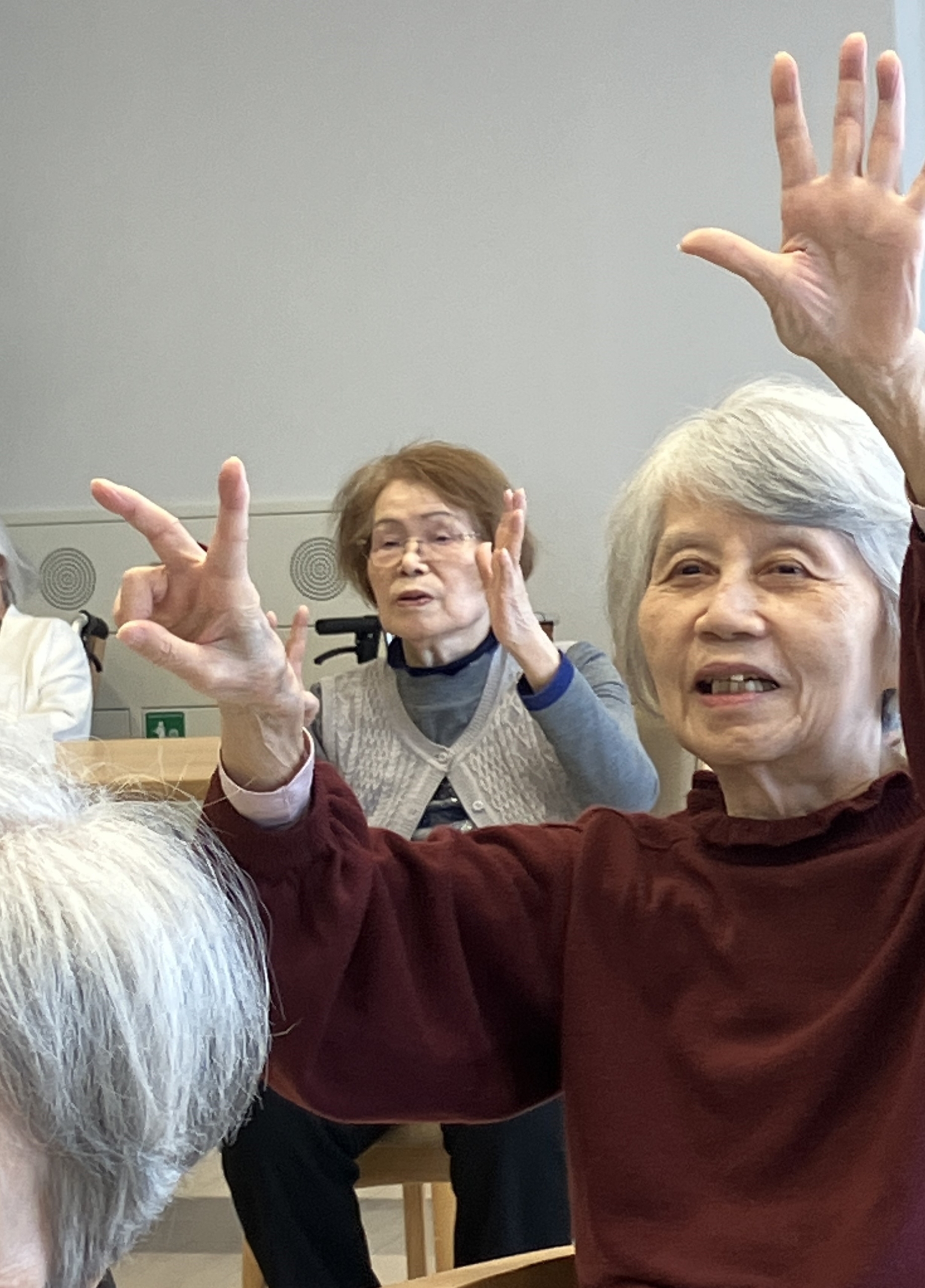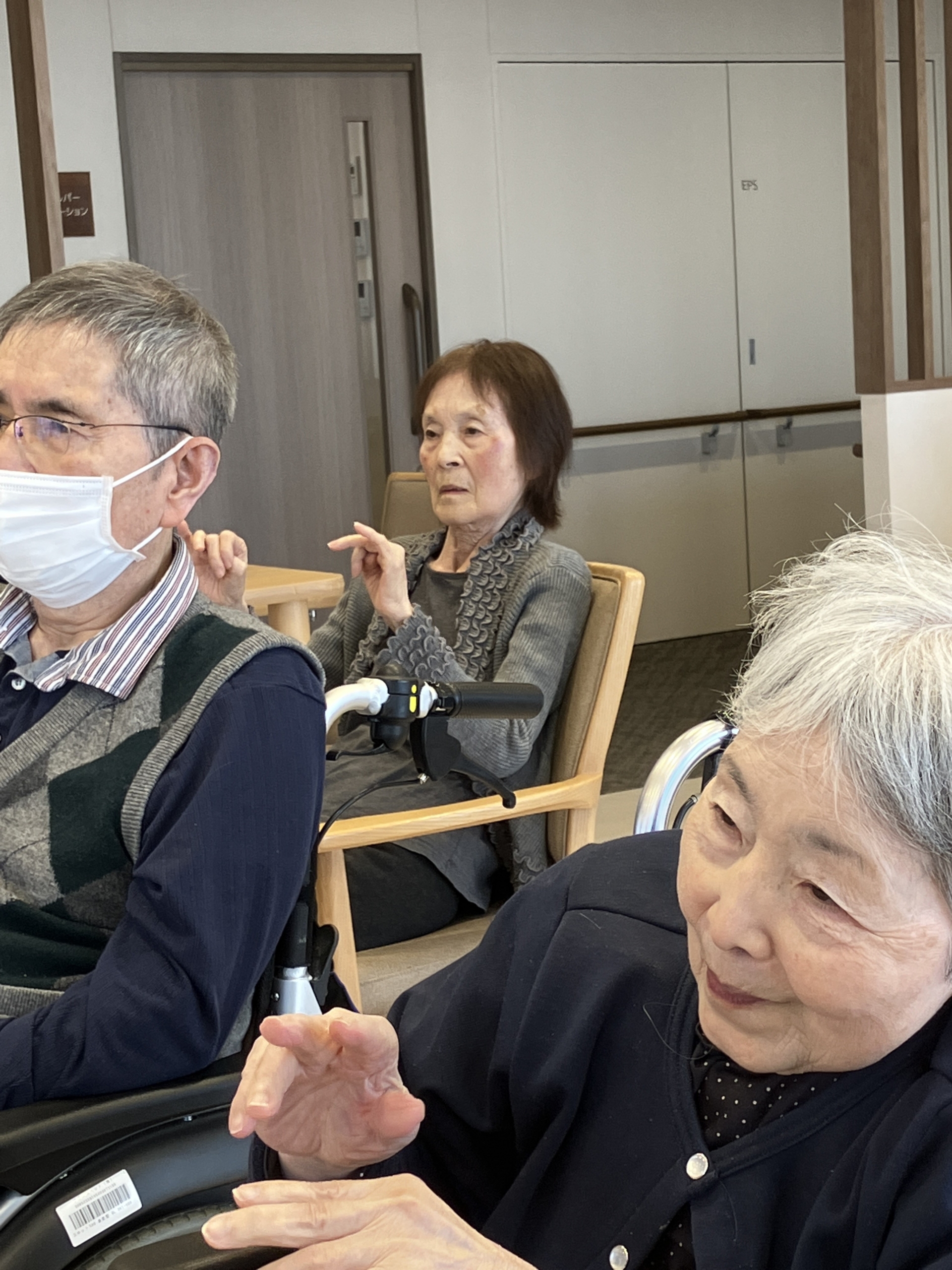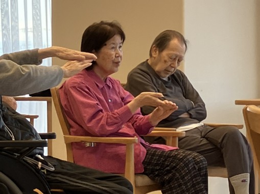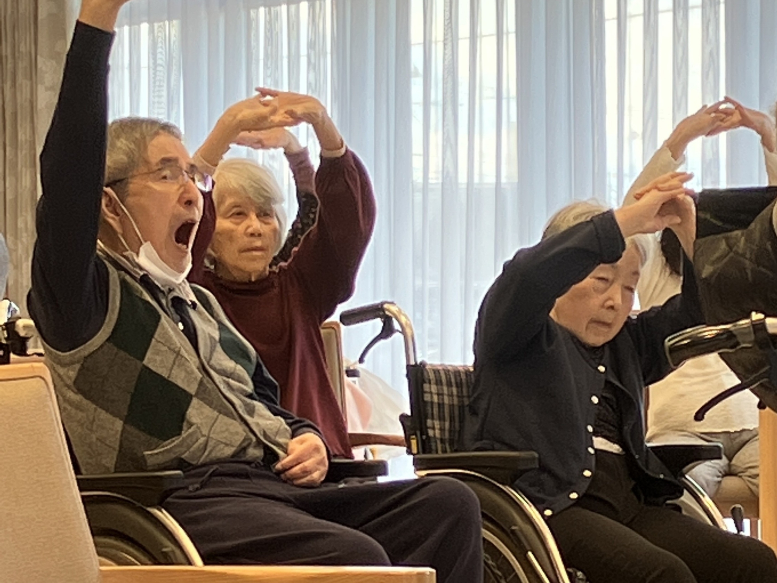 毎週金曜日の午後は機能訓練指導員による集団リハビリ体操を行っています。 歌を歌いながら手足を動かし、気持ちよさそうに体を伸ばされる姿も見られ、皆さまリラックスした表情で参加されていました。