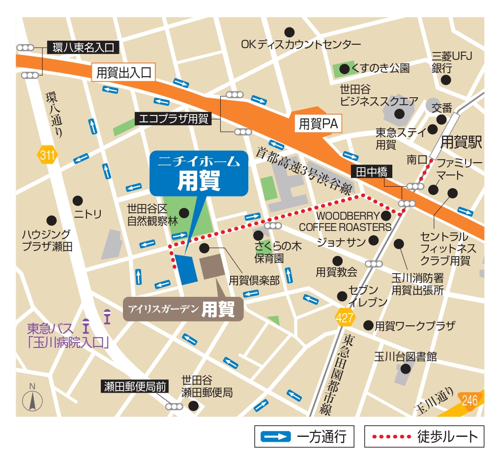 - 東急田園都市線「用賀」駅南口より徒歩7分(500m)